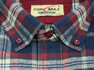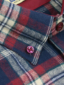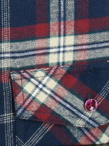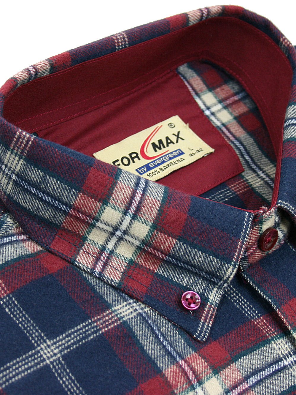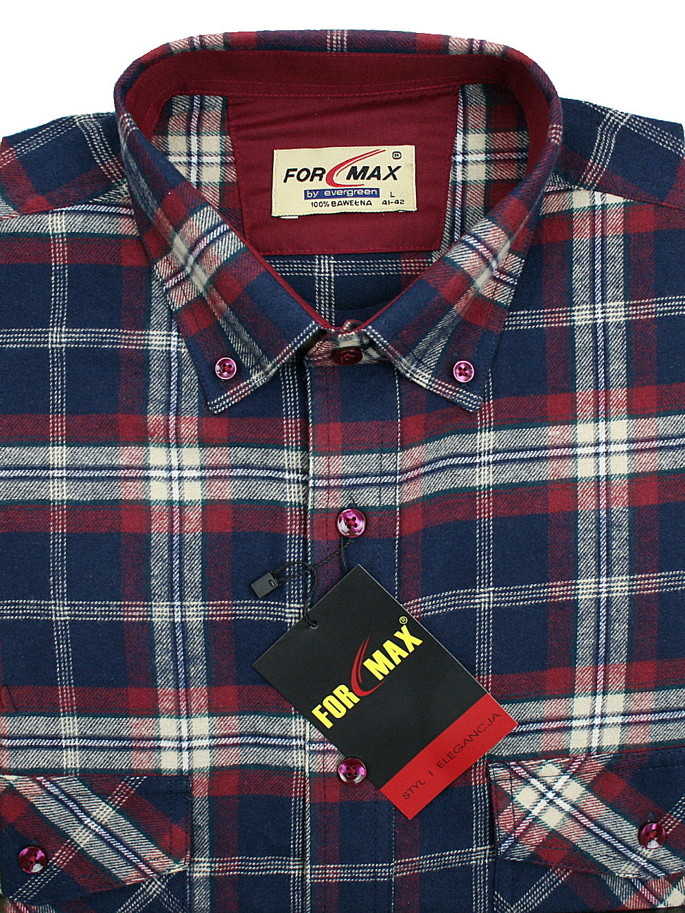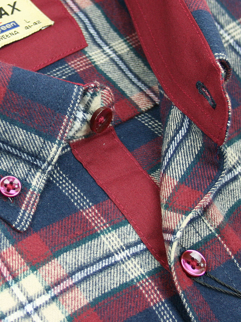 Koszula flanelowa, sylwetka klasyczna, dół koszuli zaokrąglony. Naszyte dwie kieszenie z patkami, zapinane na guzik. Spodnia część plisy oraz wew. strony stójki i mankietów w kolorze kontrastowym Kołnierzyk przypinany guzikami. Miękka tkanina bawełniana.