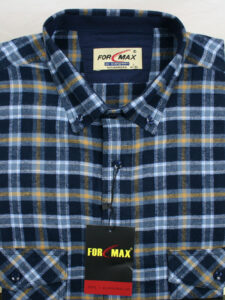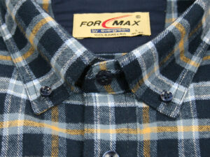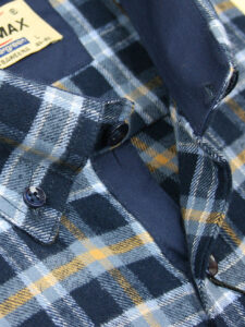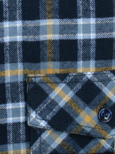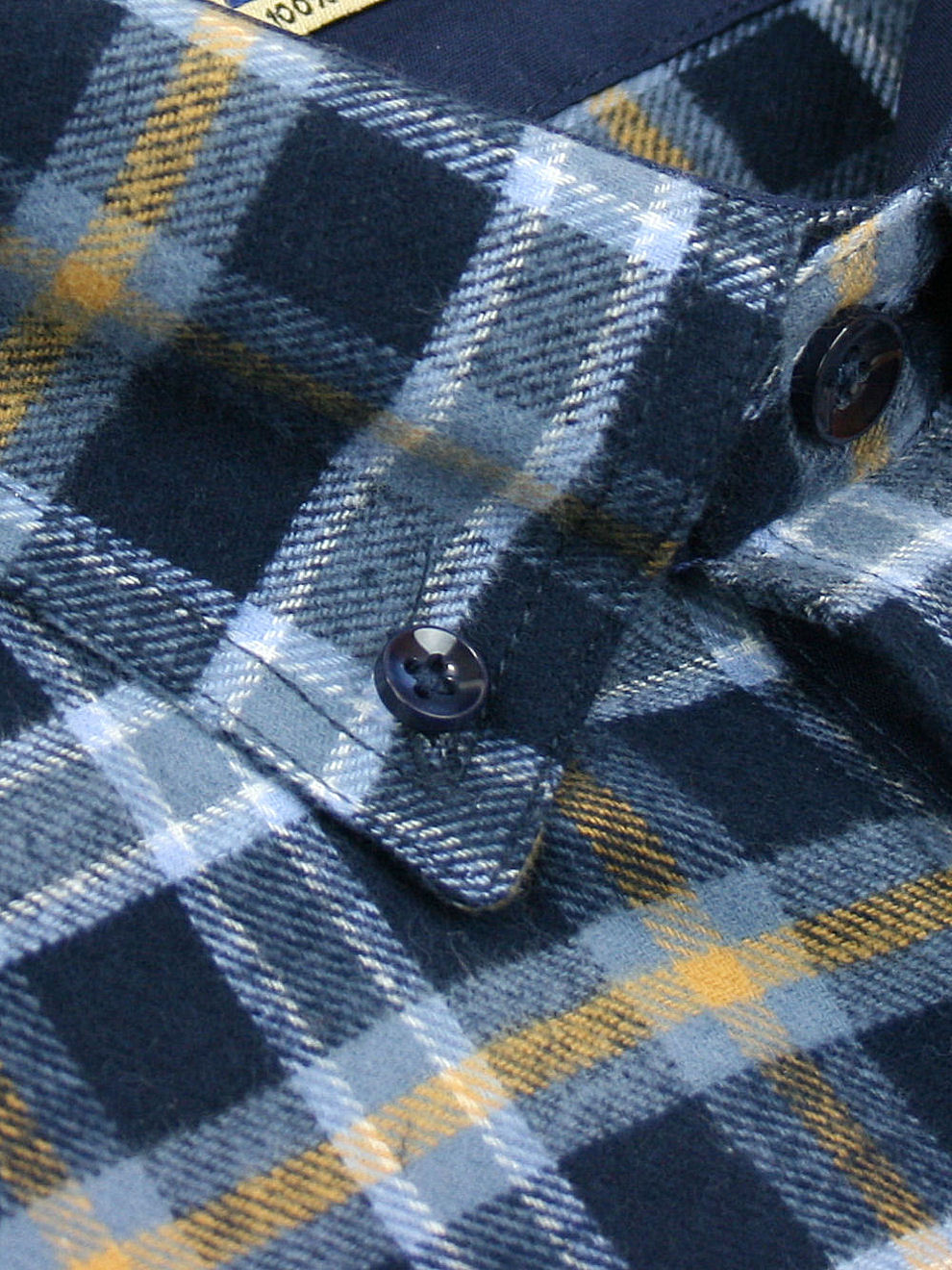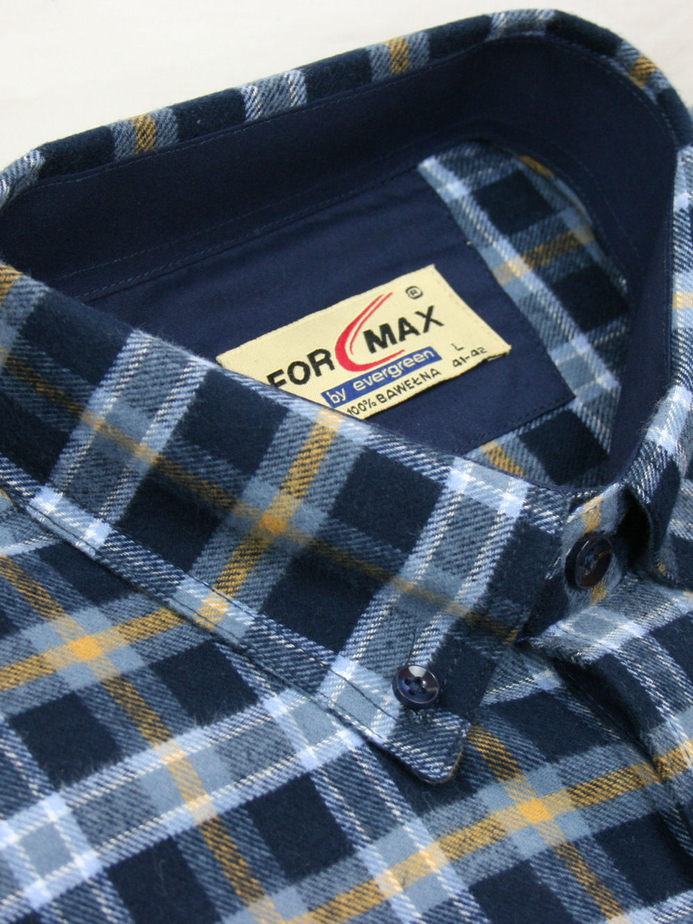 Koszula flanelowa, sylwetka klasyczna, dół koszuli zaokrąglony. Naszyte dwie kieszenie z patkami, zapinane na guzik. Spodnia część plisy oraz wew. strony stójki i mankietów w kolorze kontrastowym Kołnierzyk przypinany guzikami. Miękka tkanina bawełniana.