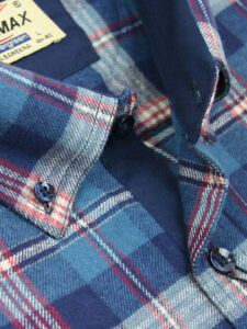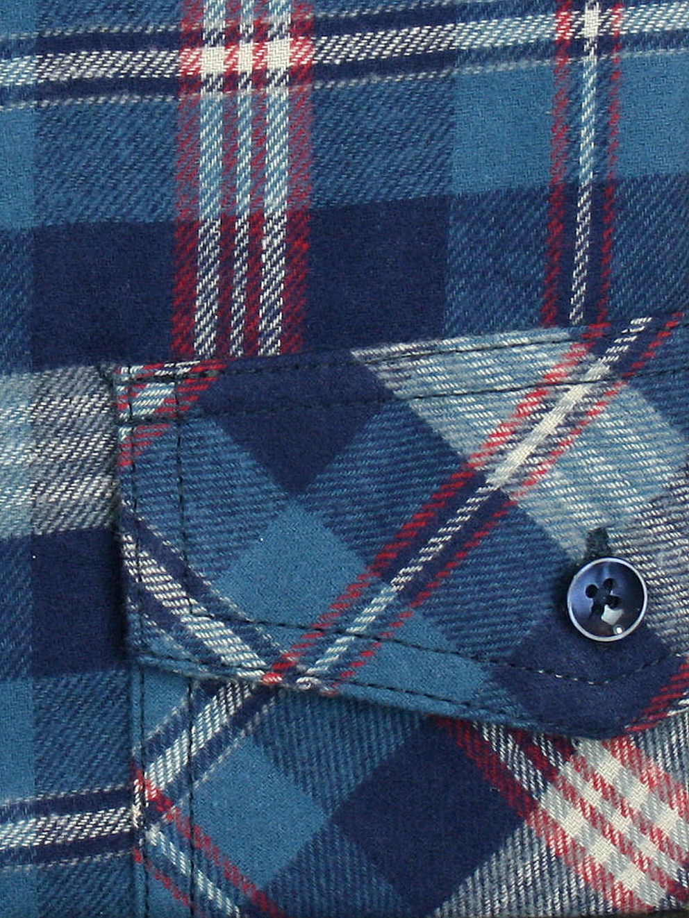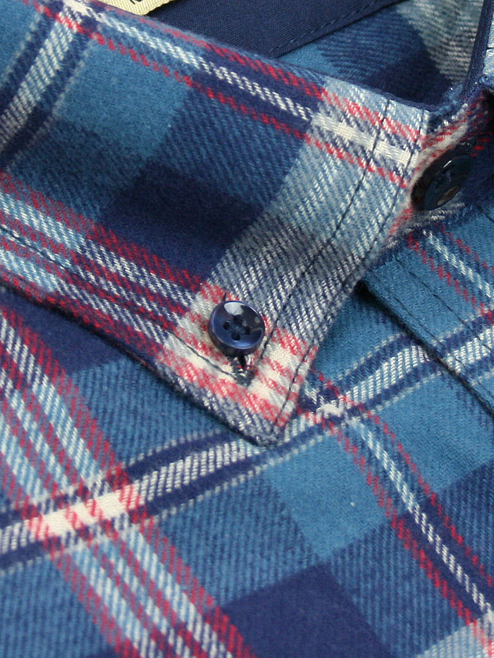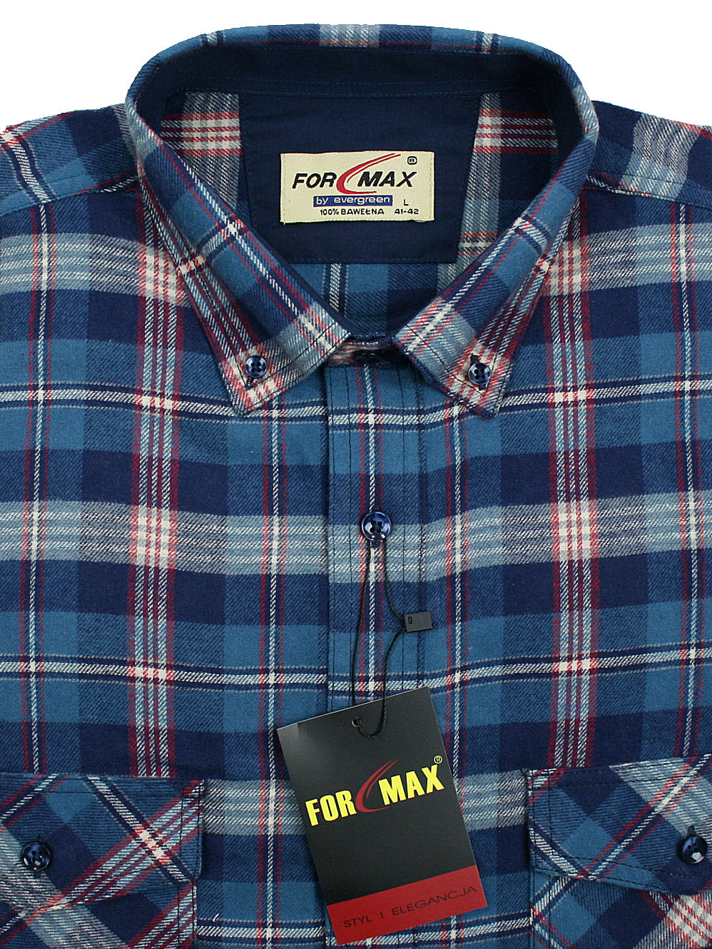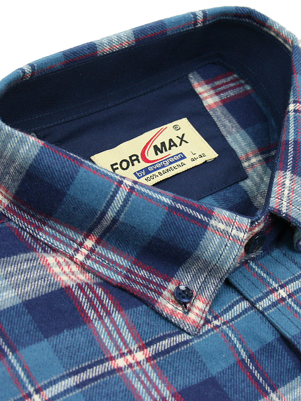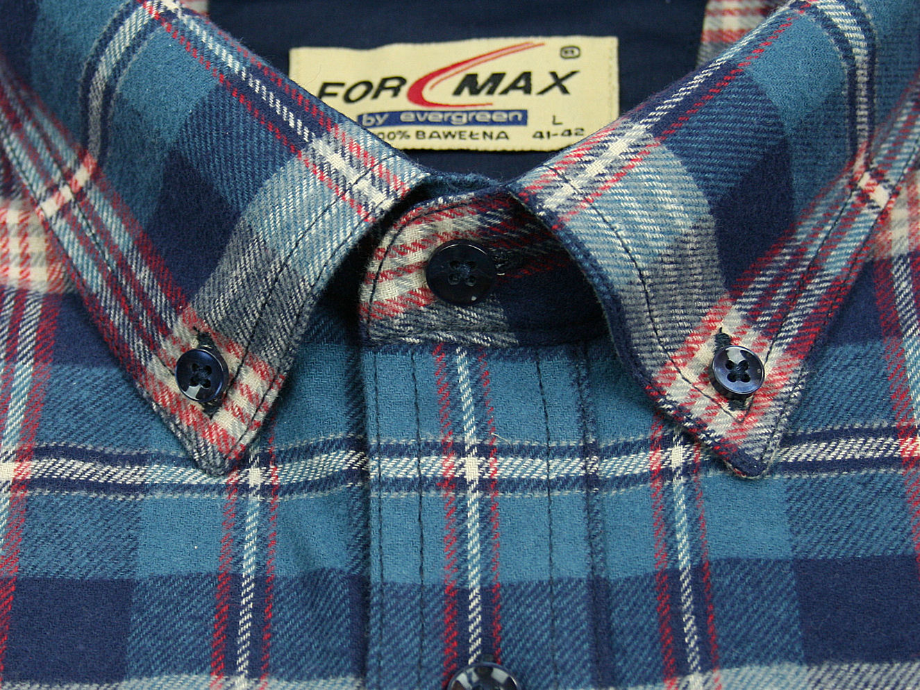 Koszula flanelowa z długim rękawem, sylwetka klasyczna, dół koszuli zaokrąglony. Naszyte dwie kieszenie z patkami, zapinane na guzik. Spodnia część plisy oraz wew. strony stójki i mankietów w kolorze kontrastowym Kołnierzyk przypinany guzikami. Miękka tkanina bawełniana.