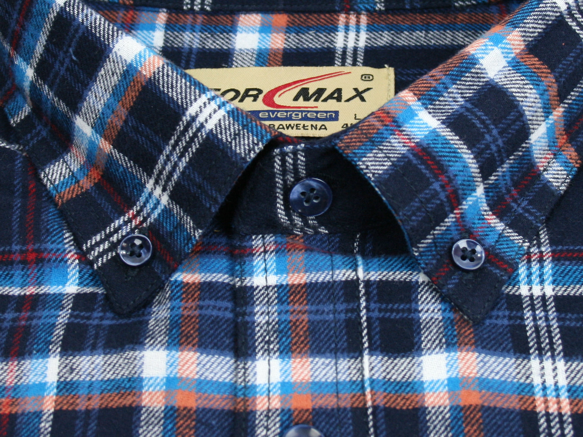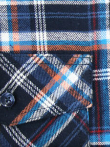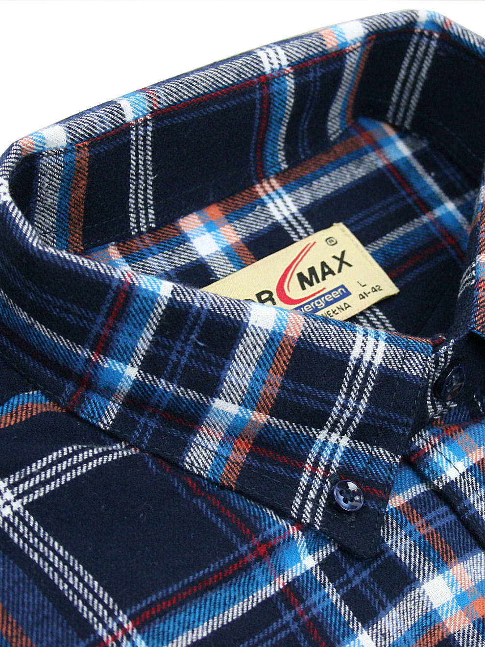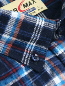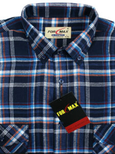 Koszula flanelowa z długim rękawem, sylwetka klasyczna, dół koszuli zaokrąglony. Naszyte dwie kieszenie z patkami, zapinane na guzik. Kołnierzyk przypinany guzikami. Miękka tkanina bawełniana.