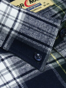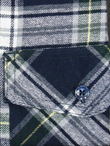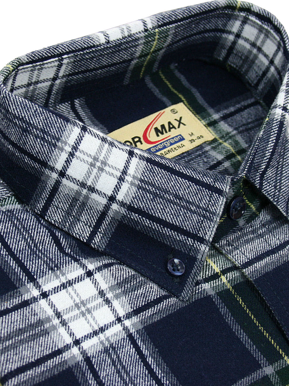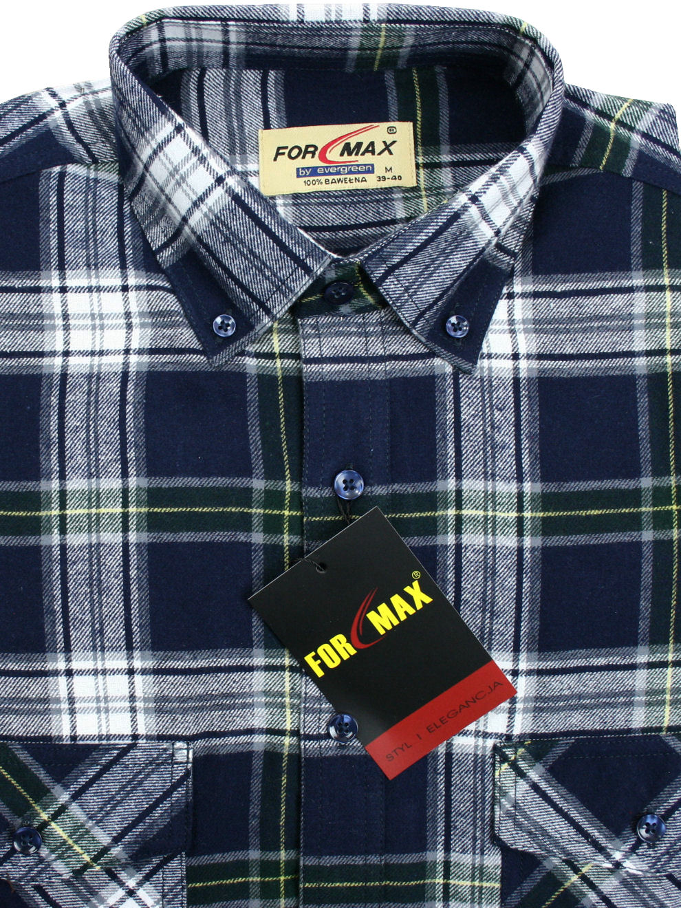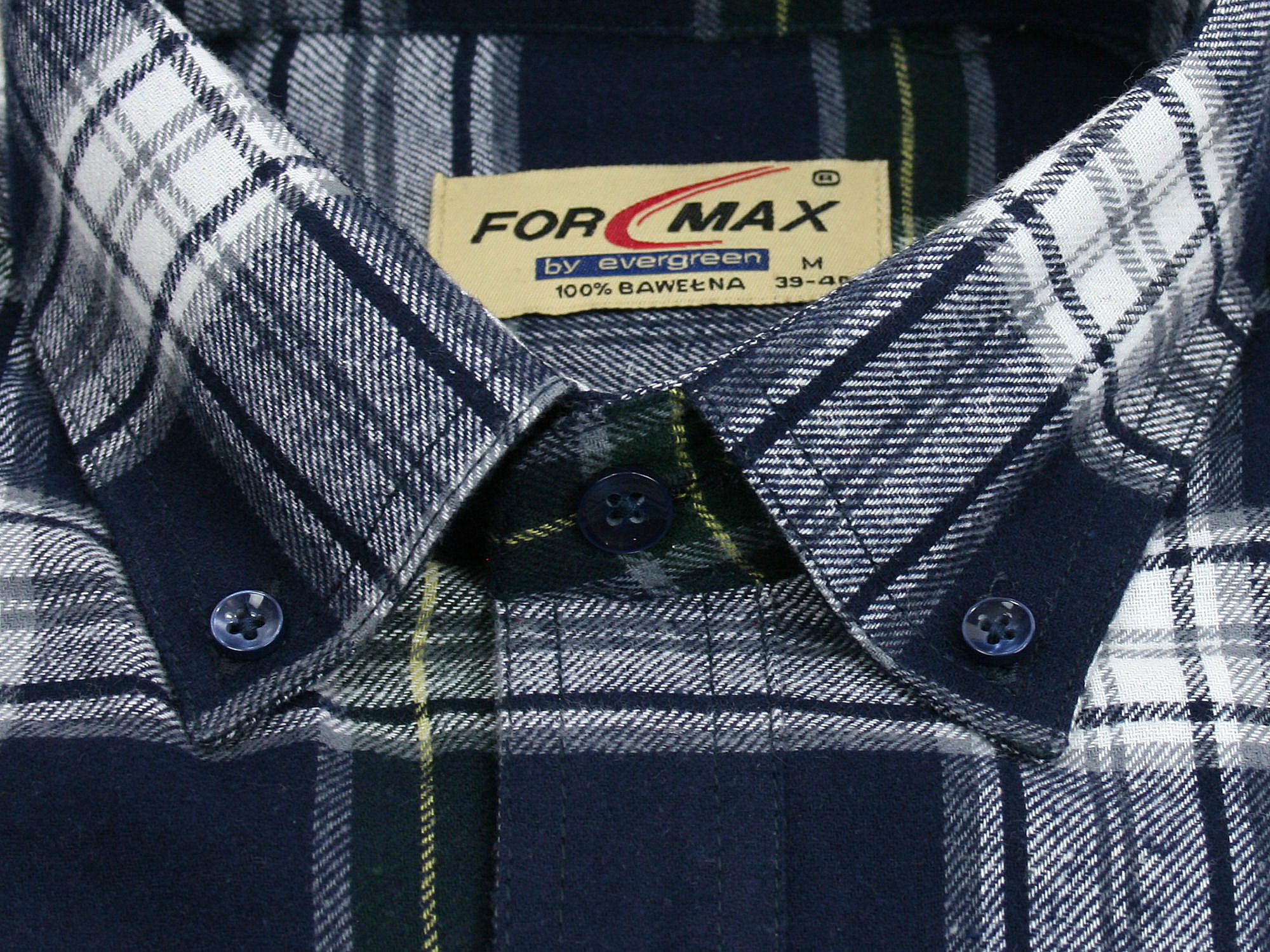 Koszula flanelowa z długim rękawem, sylwetka klasyczna, dół koszuli zaokrąglony. Naszyte dwie kieszenie z patkami, zapinane na guzik. Kołnierzyk przypinany guzikami. Miękka tkanina bawełniana.