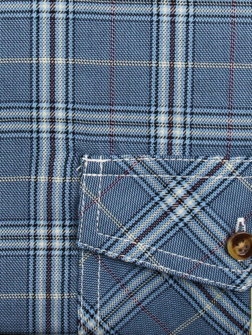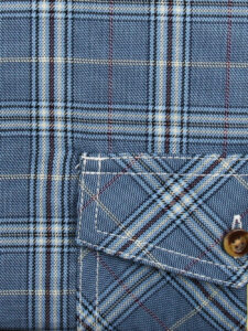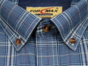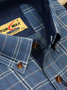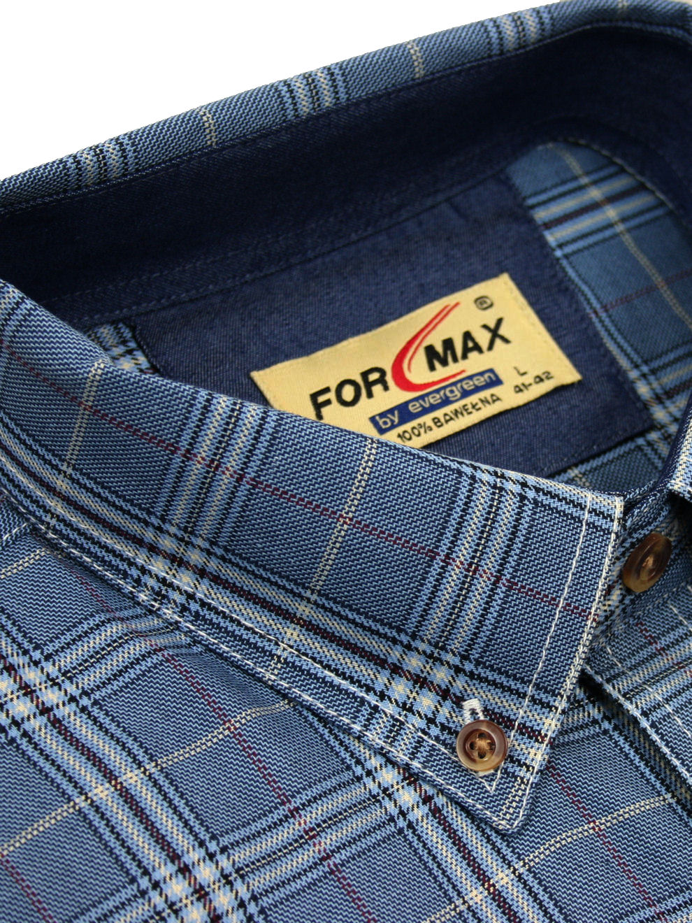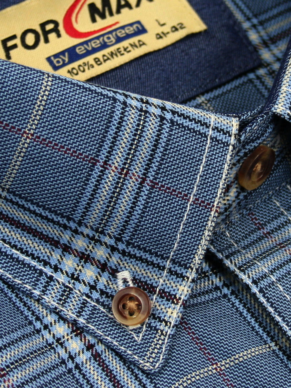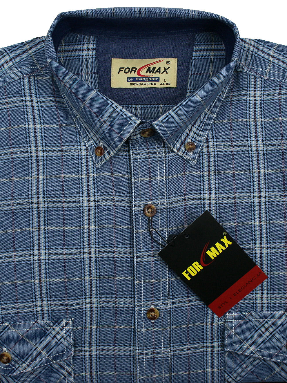 Koszula męska z długim rękawem, sylwetka klasyczna, dół koszuli zaokrąglony. Naszyte dwie kieszenie z patkami, zapinane na guzik. Spodnia część plisy oraz wew. strony stójki i mankietów w kolorze kontrastowym Kołnierzyk przypinany guzikami. Miękka tkanina bawełniana.