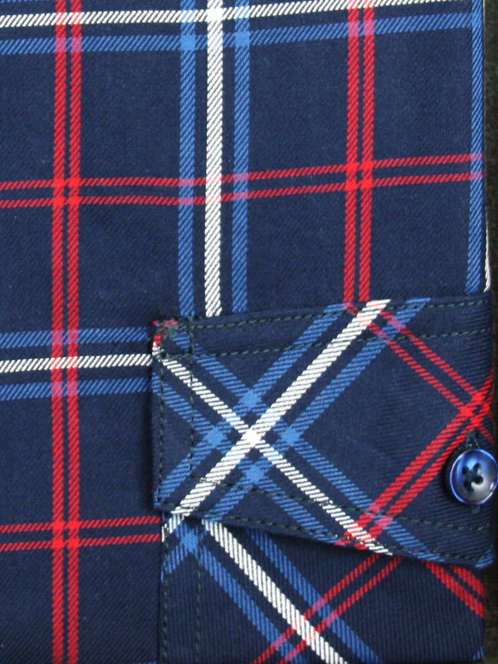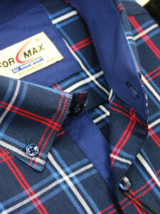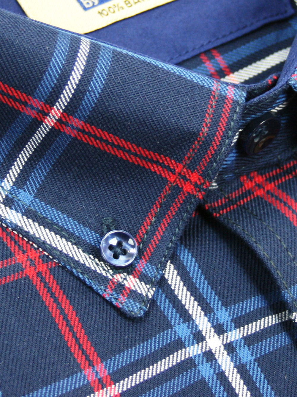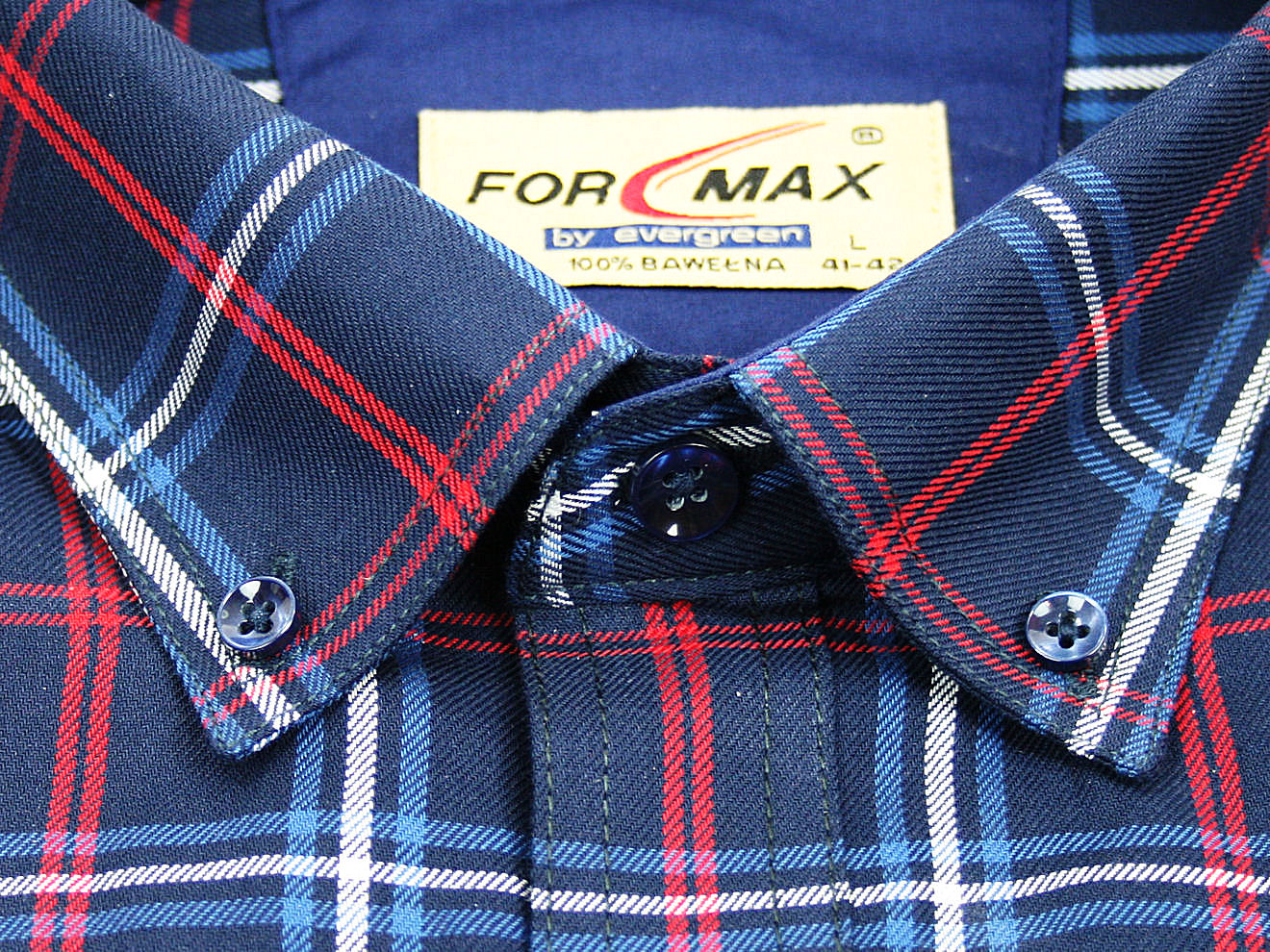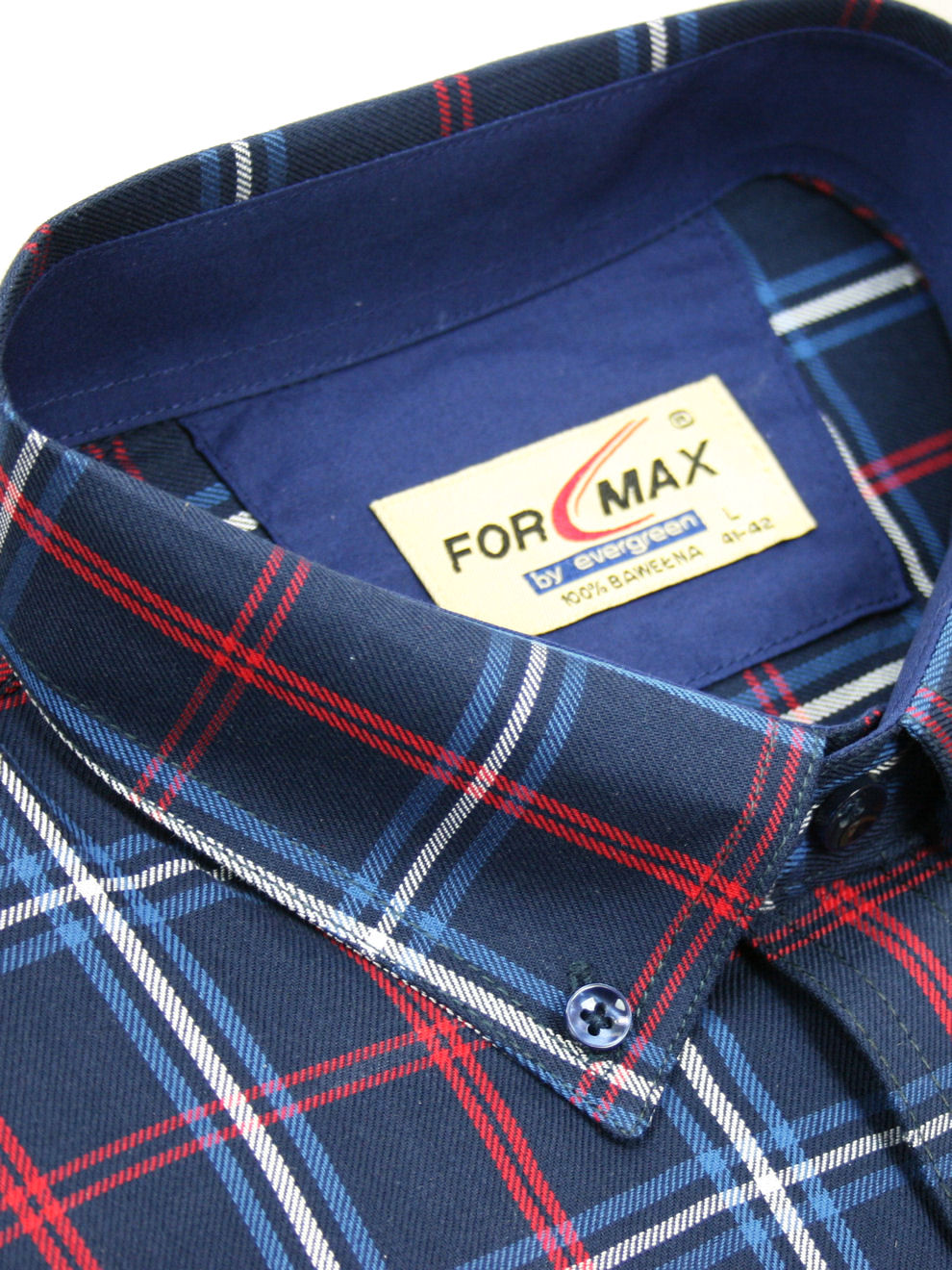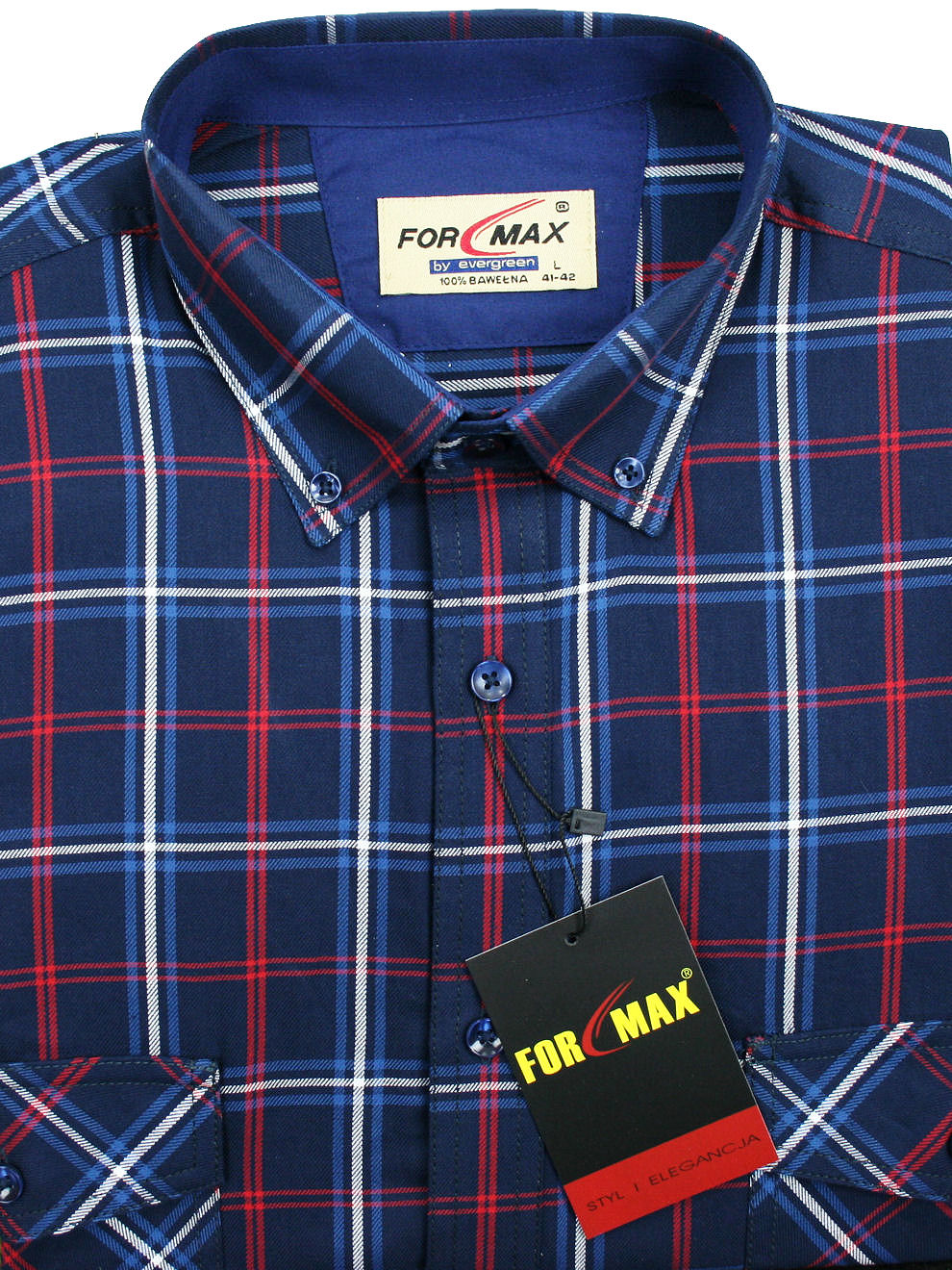 Koszula męska z długim rękawem, sylwetka klasyczna, dół koszuli zaokrąglony. Naszyte dwie kieszenie z patkami, zapinane na guzik. Spodnia część plisy oraz wew. strony stójki i mankietów w kolorze kontrastowym Kołnierzyk przypinany guzikami. Miękka tkanina bawełniana.