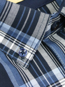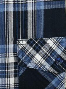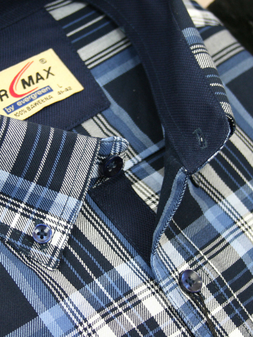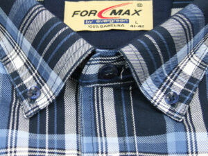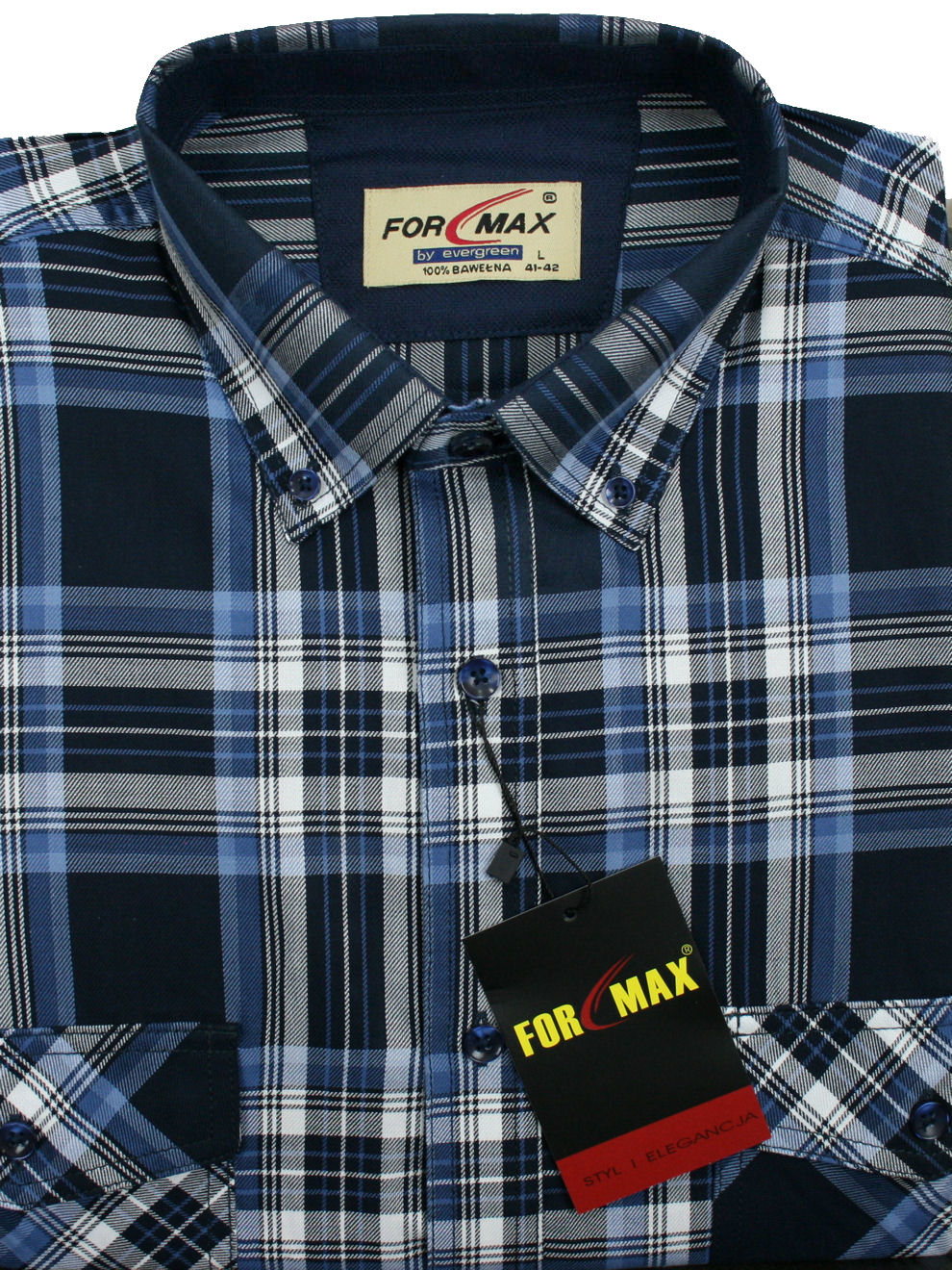 Koszula męska z długim rękawem, sylwetka klasyczna, dół koszuli zaokrąglony. Naszyte dwie kieszenie z patkami, zapinane na guzik. Spodnia część plisy oraz wew. strony stójki i mankietów w kolorze kontrastowym Kołnierzyk przypinany guzikami. Miękka tkanina bawełniana.