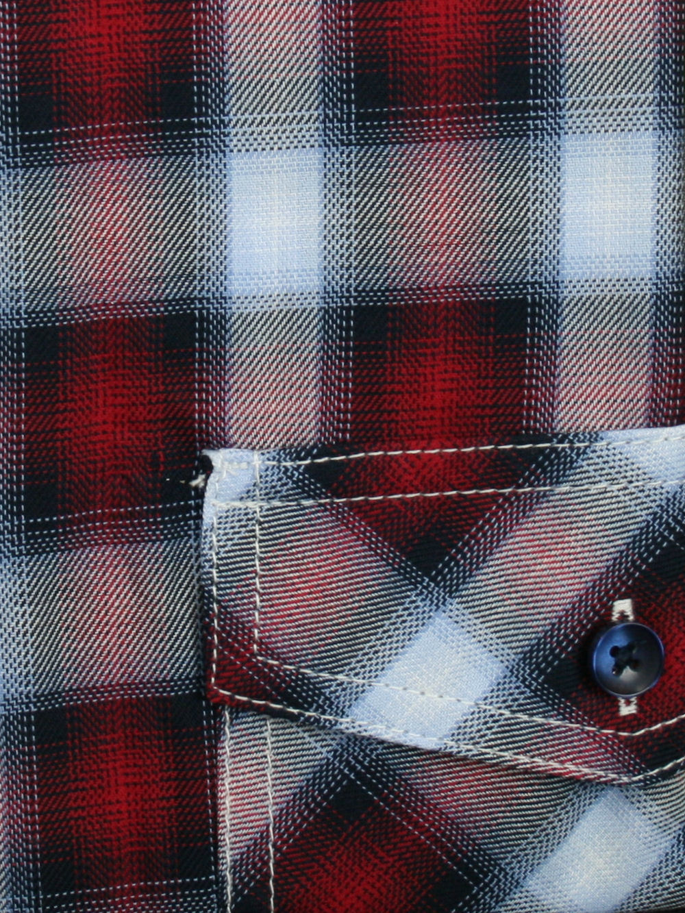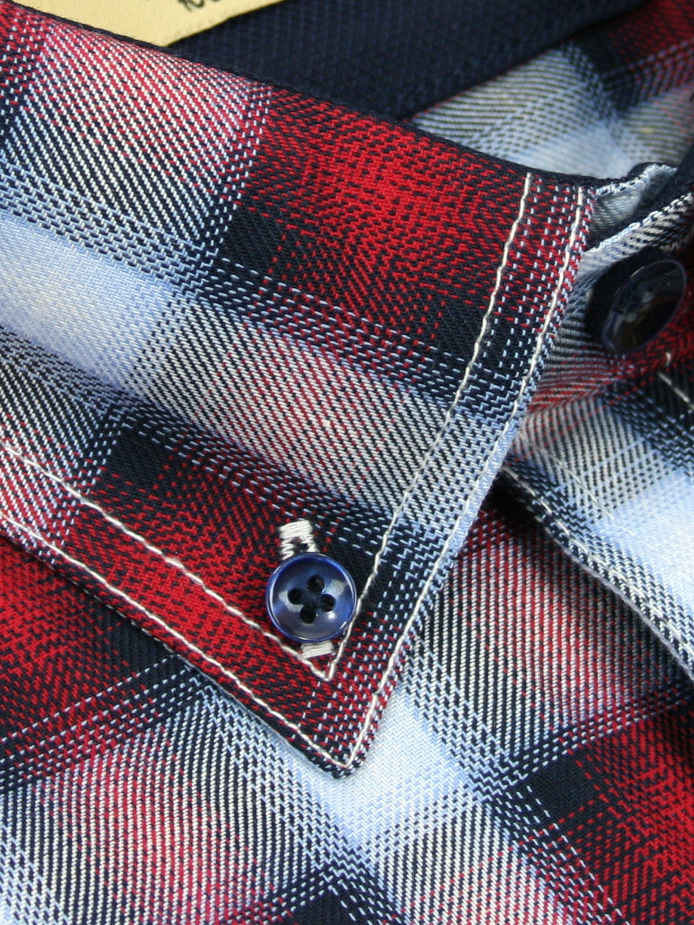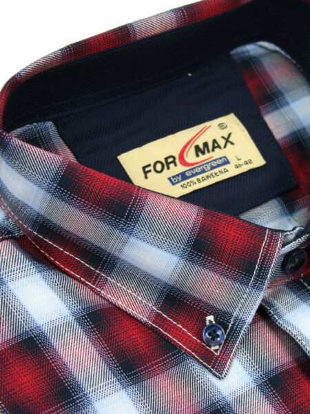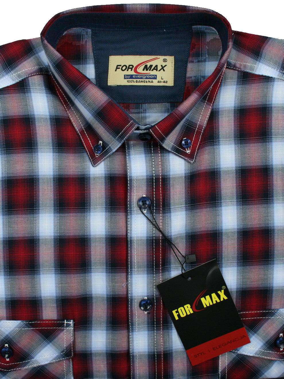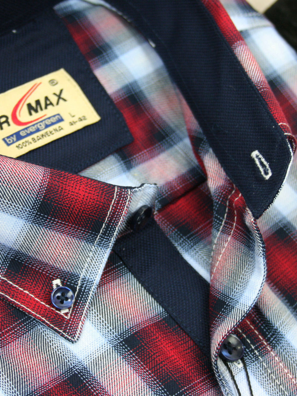 Koszula męska z długim rękawem, sylwetka klasyczna, dół koszuli zaokrąglony. Naszyte dwie kieszenie z patkami, zapinane na guzik. Spodnia część plisy oraz wew. strony stójki i mankietów w kolorze kontrastowym Kołnierzyk przypinany guzikami. Miękka tkanina bawełniana.