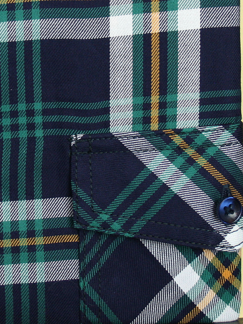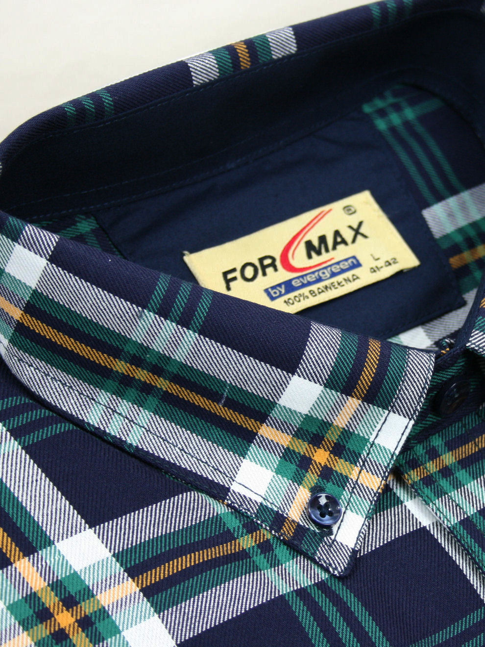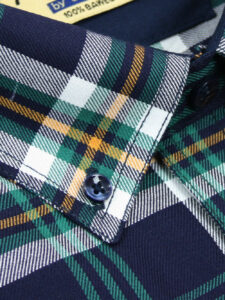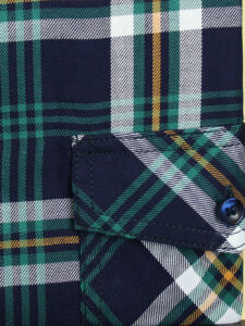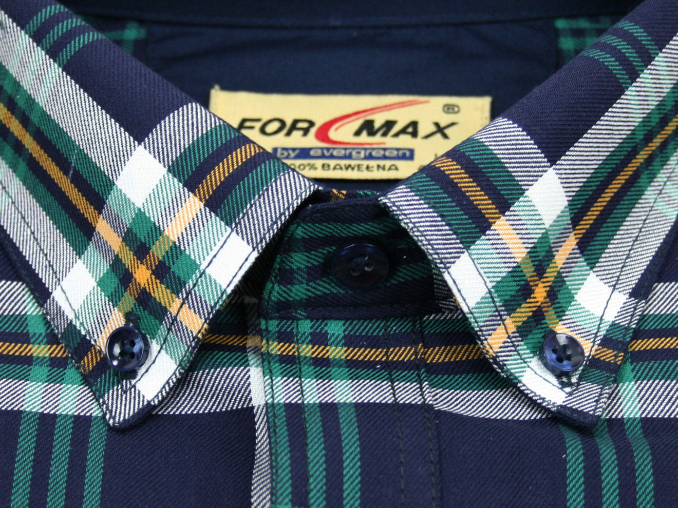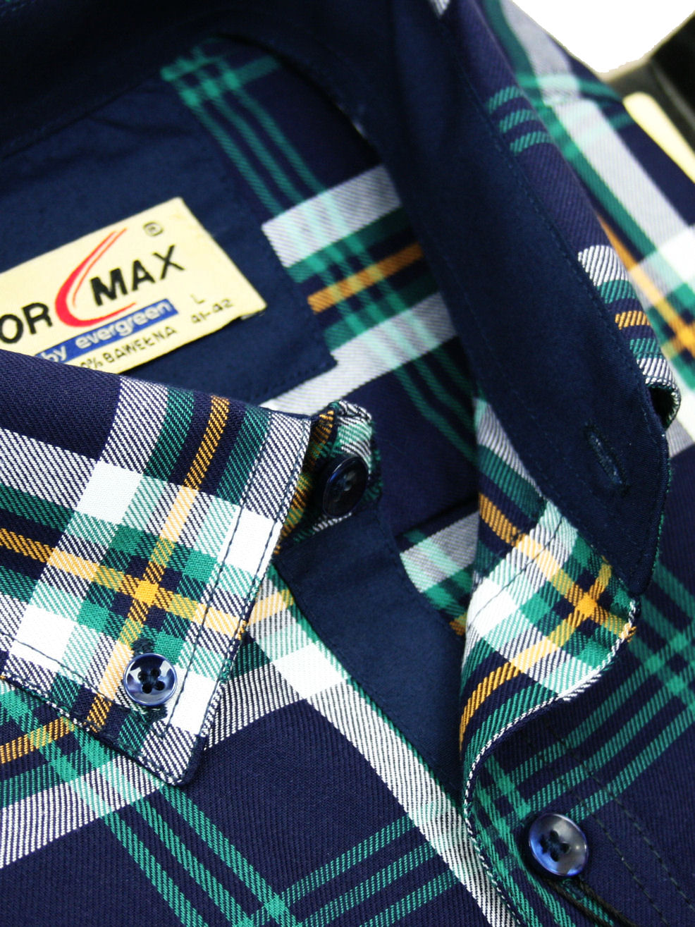 Koszula męska z długim rękawem, sylwetka klasyczna, dół koszuli zaokrąglony. Naszyte dwie kieszenie z patkami, zapinane na guzik. Spodnia część plisy oraz wew. strony stójki i mankietów w kolorze kontrastowym Kołnierzyk przypinany guzikami. Miękka tkanina bawełniana.