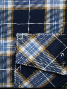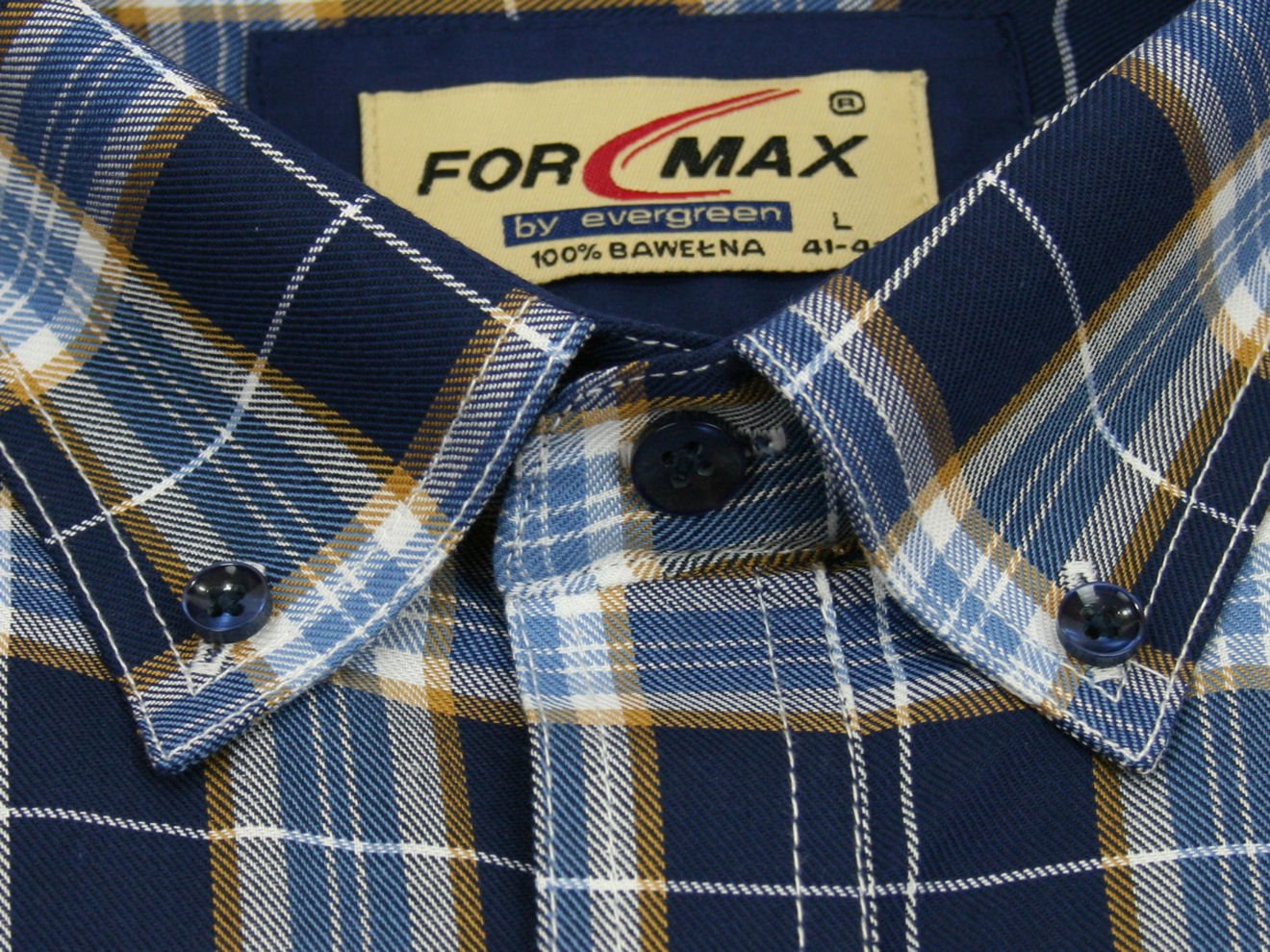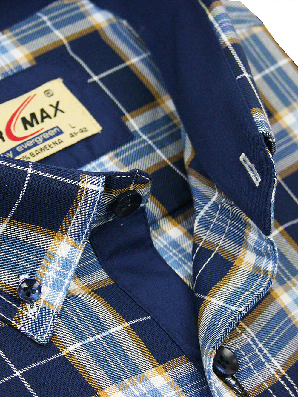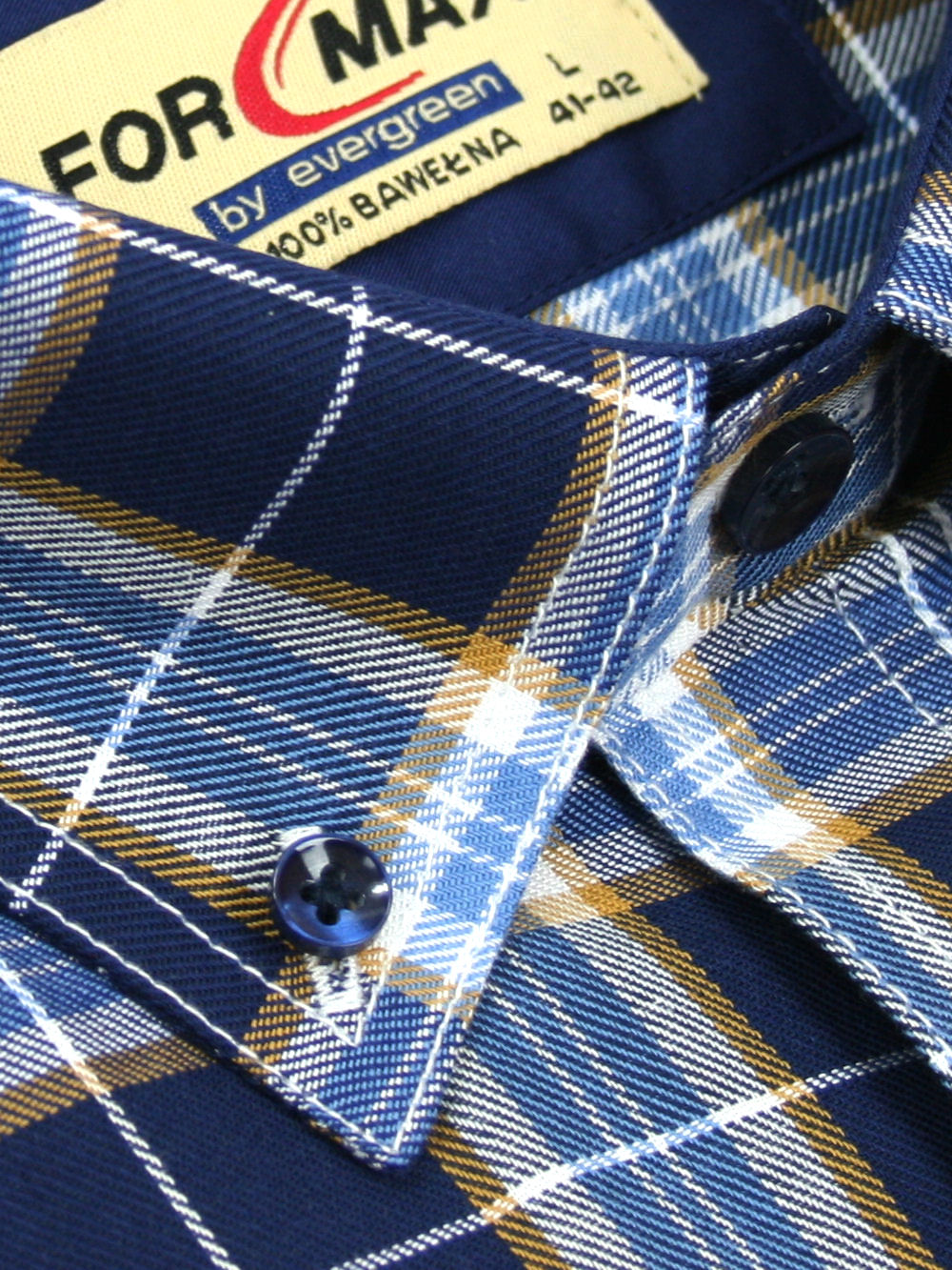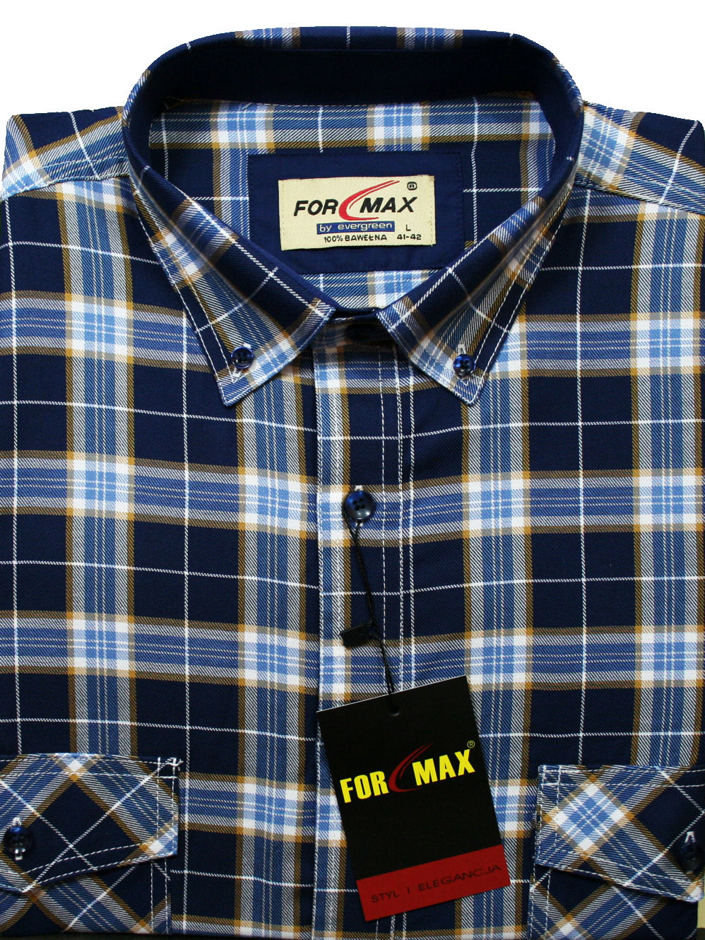 Koszula męska z długim rękawem, sylwetka klasyczna, dół koszuli zaokrąglony. Naszyte dwie kieszenie z patkami, zapinane na guzik. Spodnia część plisy oraz wew. strony stójki i mankietów w kolorze kontrastowym Kołnierzyk przypinany guzikami. Miękka tkanina bawełniana.