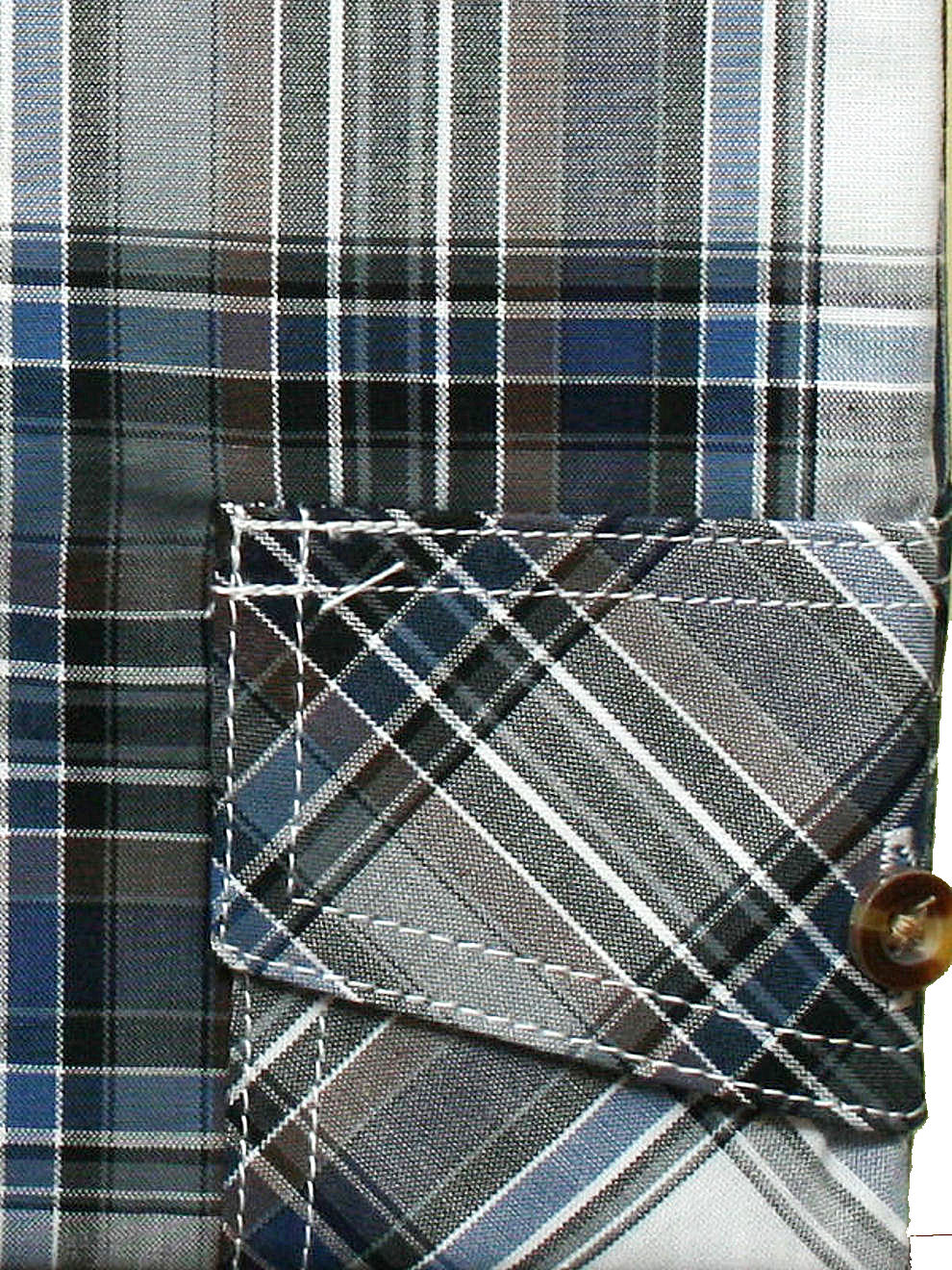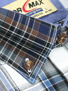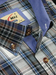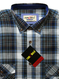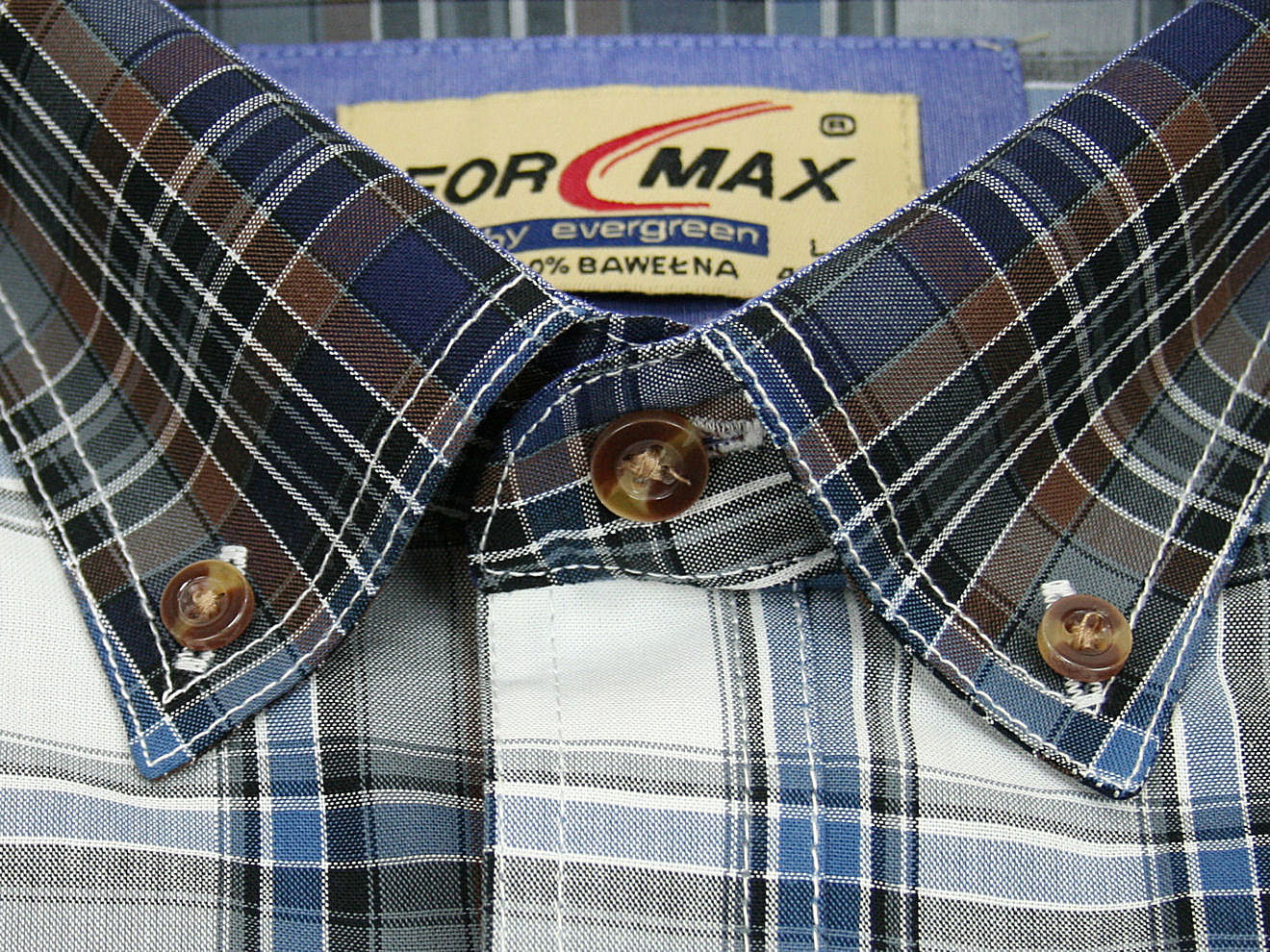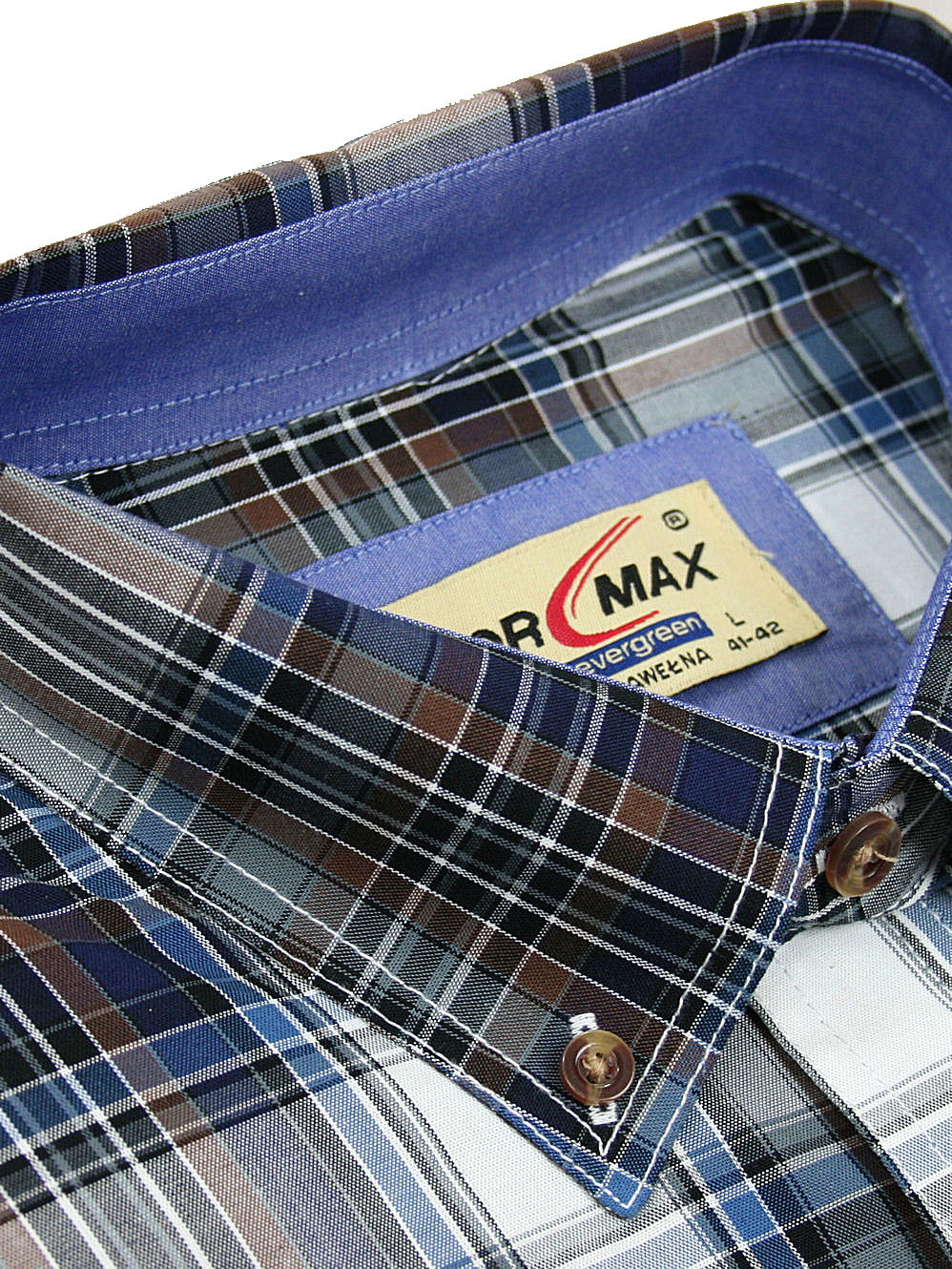 Koszula męska z długim rękawem, sylwetka klasyczna, dół koszuli zaokrąglony. Naszyte dwie kieszenie z patkami, zapinane na guzik. Spodnia część plisy oraz wew. strony stójki i mankietów w kolorze kontrastowym Kołnierzyk przypinany guzikami. Miękka tkanina bawełniana.