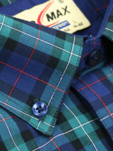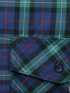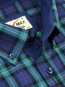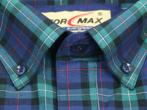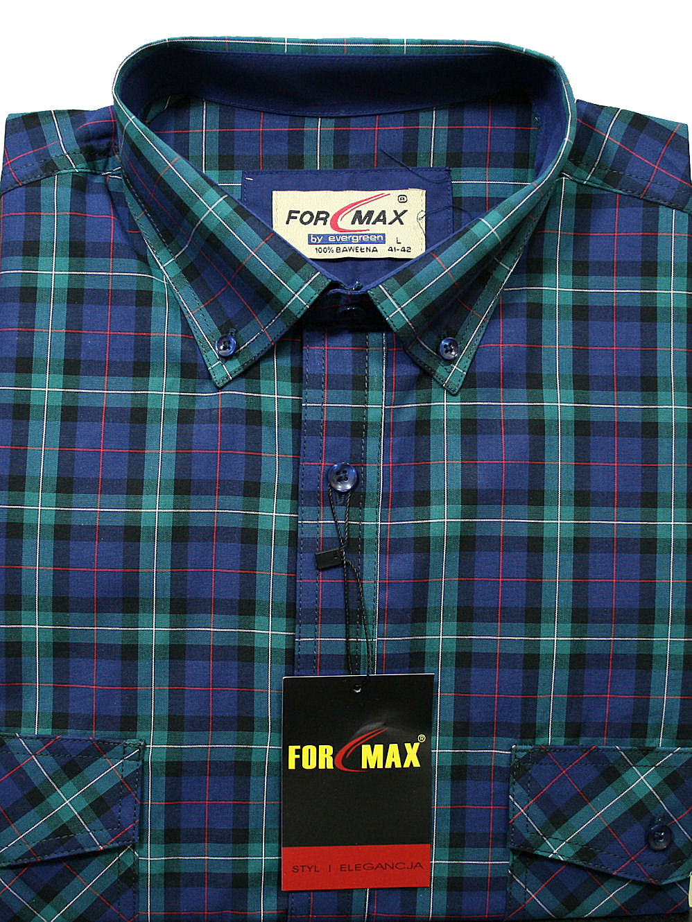 Koszula męska z długim rękawem, sylwetka klasyczna, dół koszuli zaokrąglony. Naszyte dwie kieszenie z patkami, zapinane na guzik. Spodnia część plisy oraz wew. strony stójki i mankietów w kolorze kontrastowym Kołnierzyk przypinany guzikami. Miękka tkanina bawełniana.