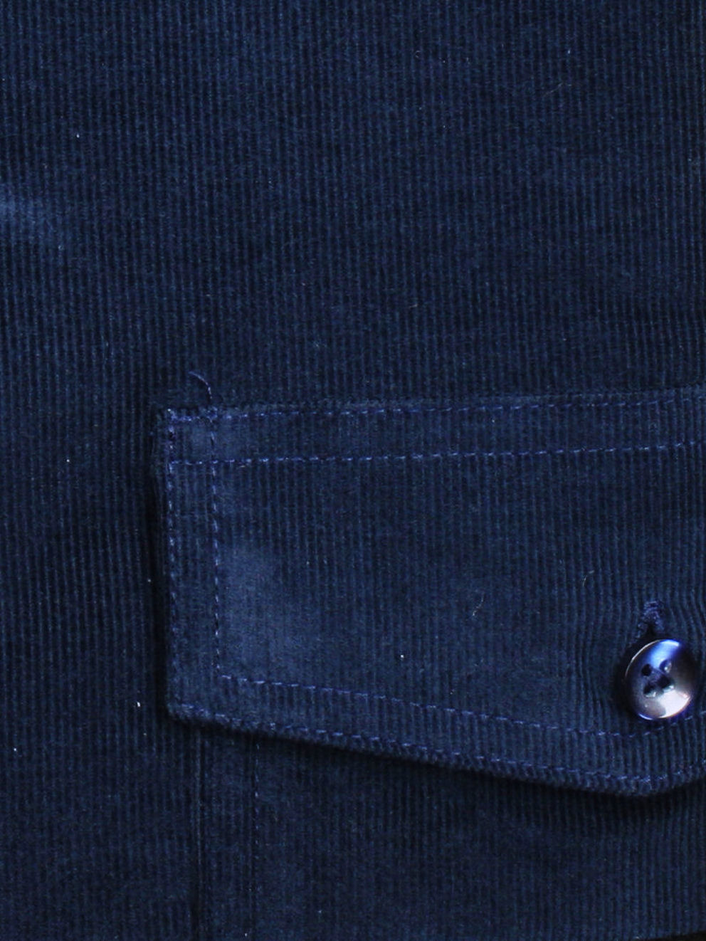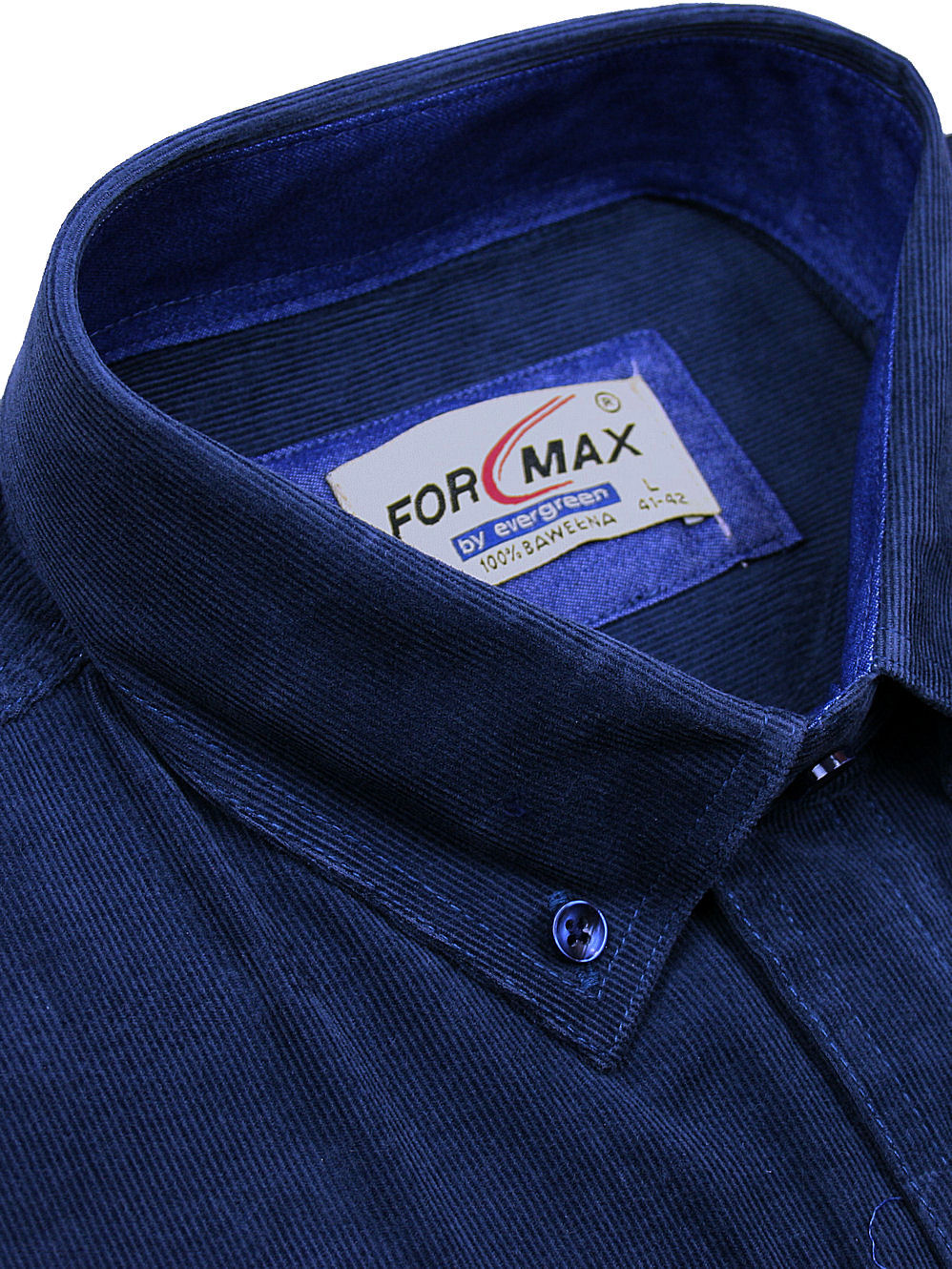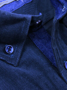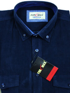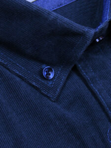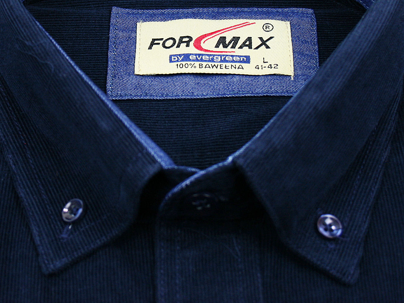 Koszula męska sztruksowa, sylwetka klasyczna, dół koszuli zaokrąglony. Naszyte dwie kieszenie z patkami, zapinane na guzik. Wewnętrzne strony stójki i mankietów w kolorze kontrastowym Kołnierzyk przypinany guzikami.