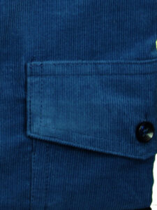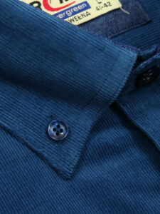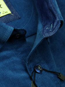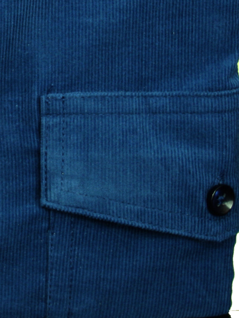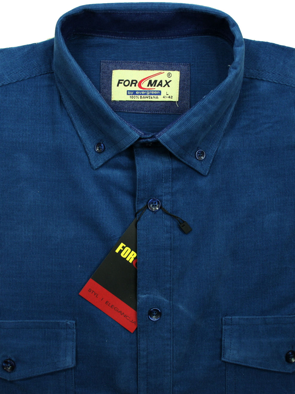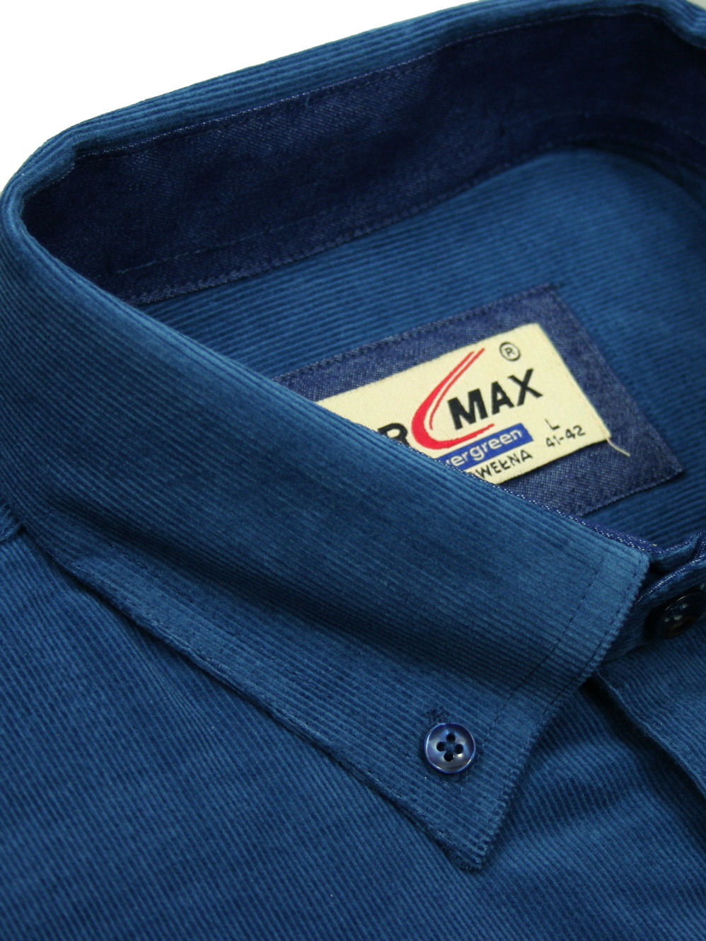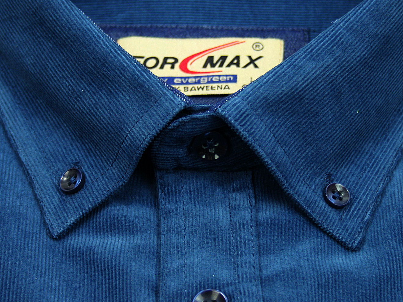 Koszula męska sztruksowa, sylwetka klasyczna, dół koszuli zaokrąglony. Naszyte dwie kieszenie z patkami, zapinane na guzik. Wewnętrzne strony stójki i mankietów w kolorze kontrastowym Kołnierzyk przypinany guzikami.