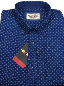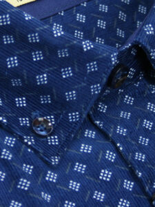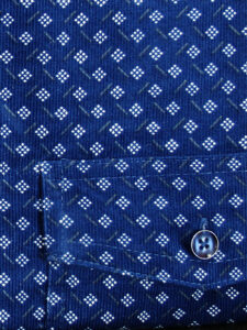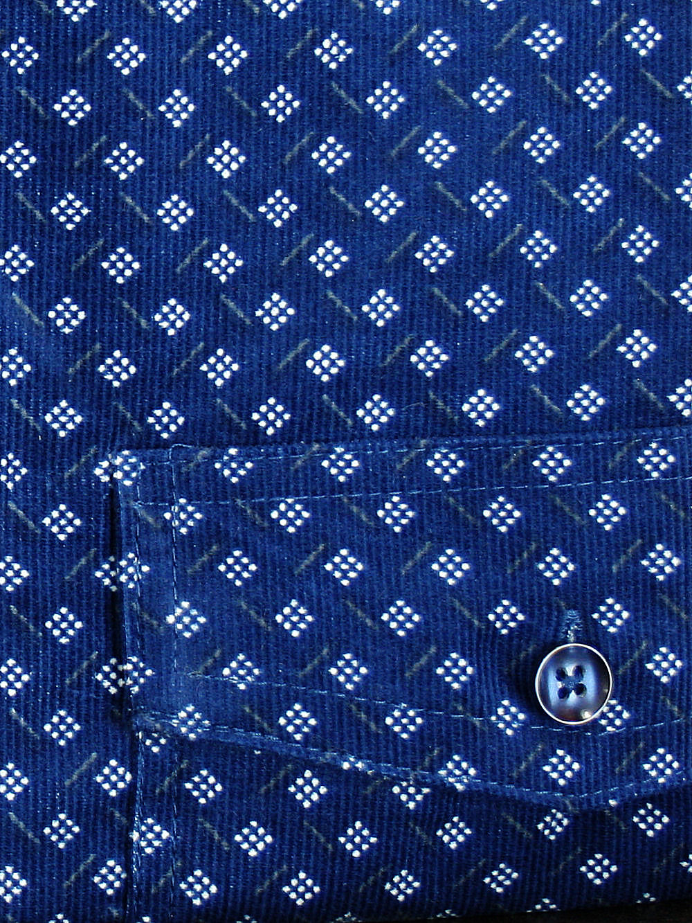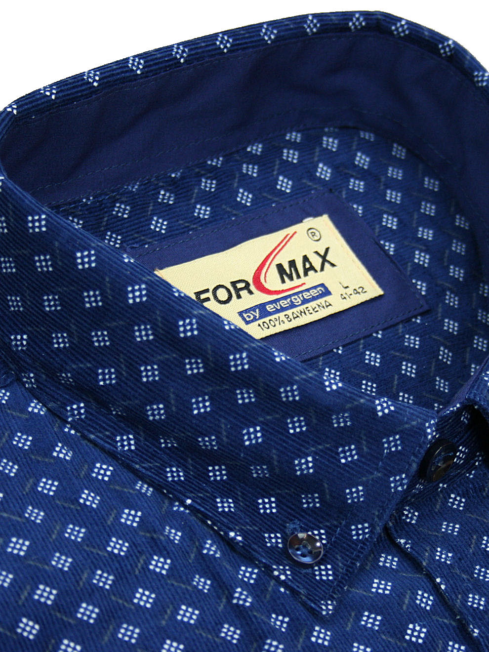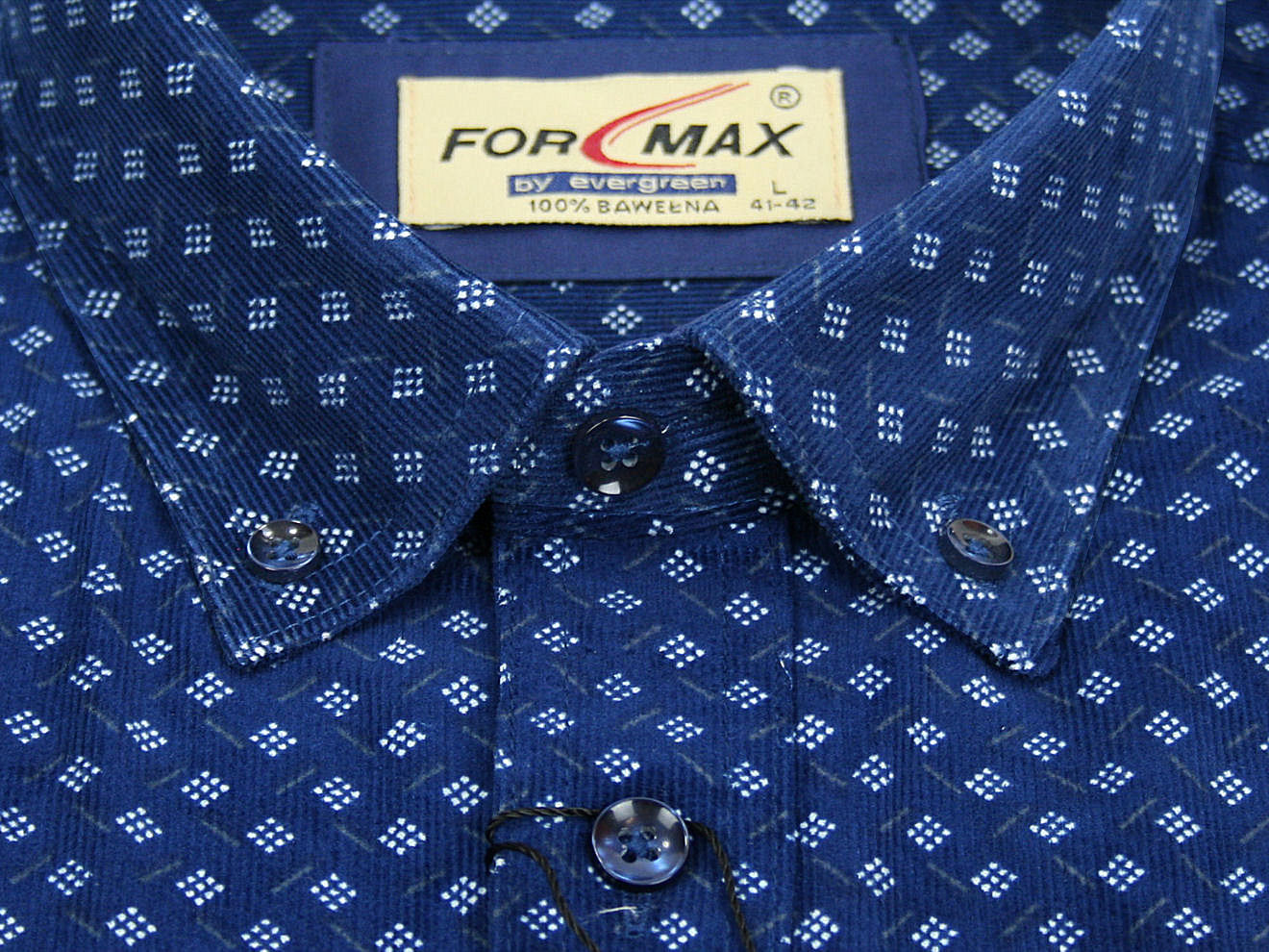 Koszula męska sztruksowa, sylwetka klasyczna, dół koszuli zaokrąglony. Naszyte dwie kieszenie z patkami, zapinane na guzik. Wewnętrzne strony stójki i mankietów w kolorze kontrastowym Kołnierzyk przypinany guzikami.