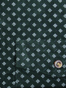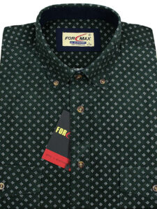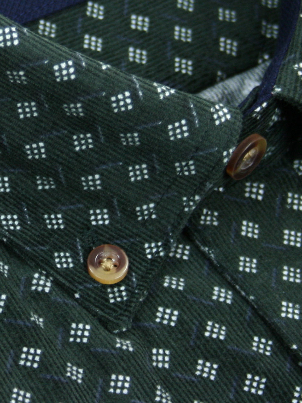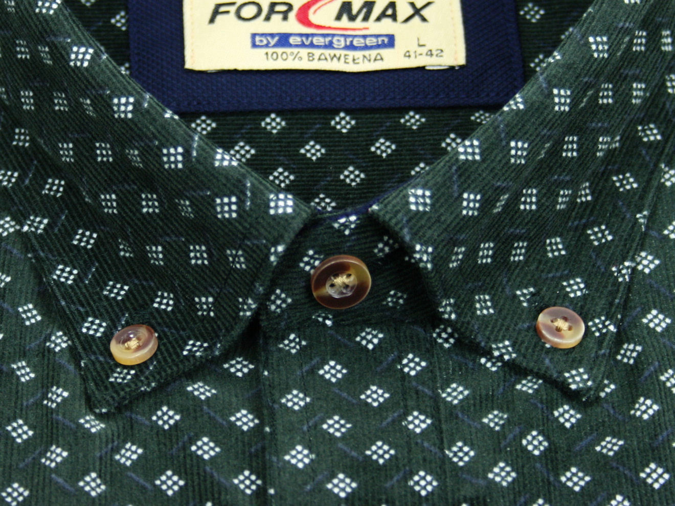Koszula męska sztruksowa, sylwetka klasyczna, dół koszuli zaokrąglony. Naszyte dwie kieszenie z patkami, zapinane na guzik. Wewnętrzne strony stójki i mankietów w kolorze kontrastowym Kołnierzyk przypinany guzikami.