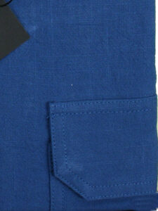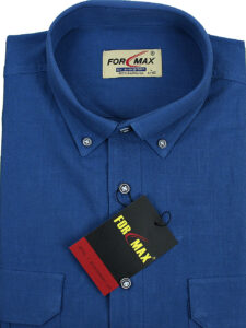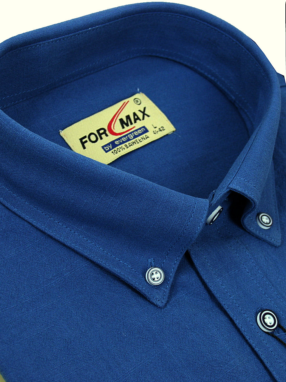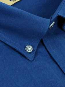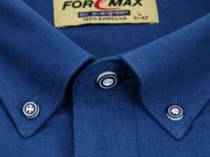 Koszula męska z długim rękawem, sylwetka klasyczna, dół koszuli zaokrąglony. Naszyte dwie kieszenie z patkami, zapinane na guzik. Kołnierzyk przypinany guzikami. Miękka tkanina bawełniana z wykończeniem a’la len.