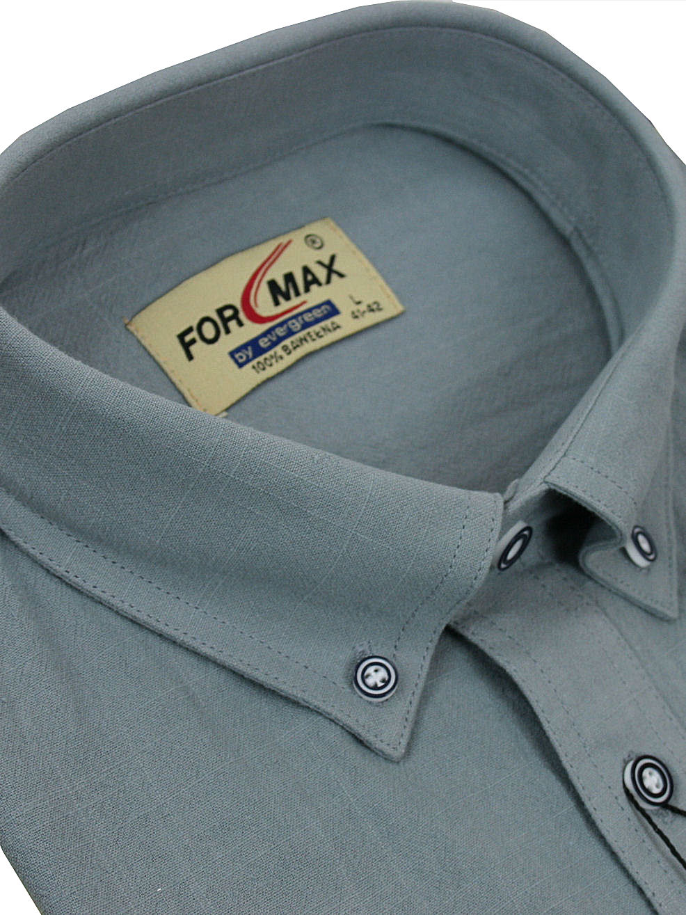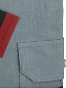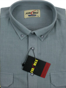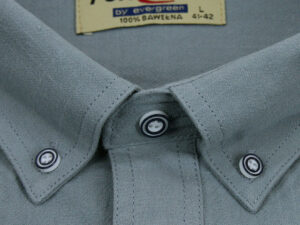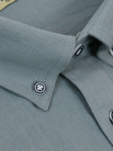 Koszula męska z długim rękawem, sylwetka klasyczna, dół koszuli zaokrąglony. Naszyte dwie kieszenie z patkami, zapinane na guzik. Kołnierzyk przypinany guzikami. Miękka tkanina bawełniana z wykończeniem a’la len.