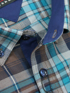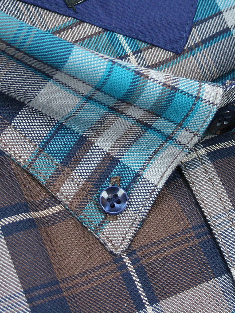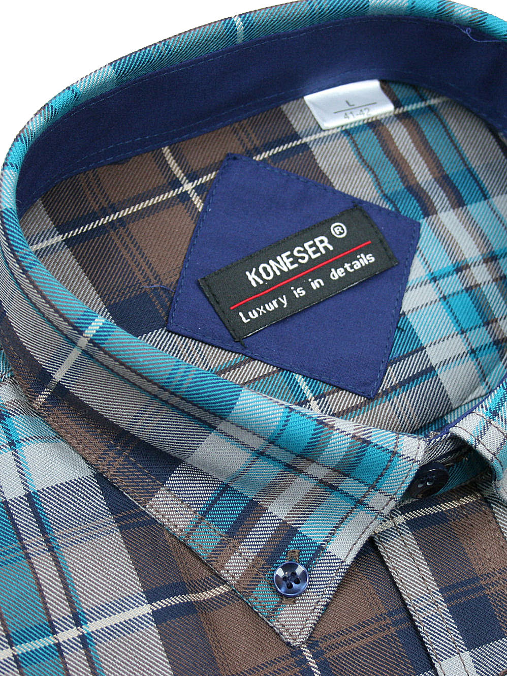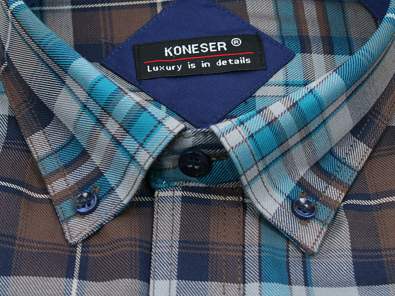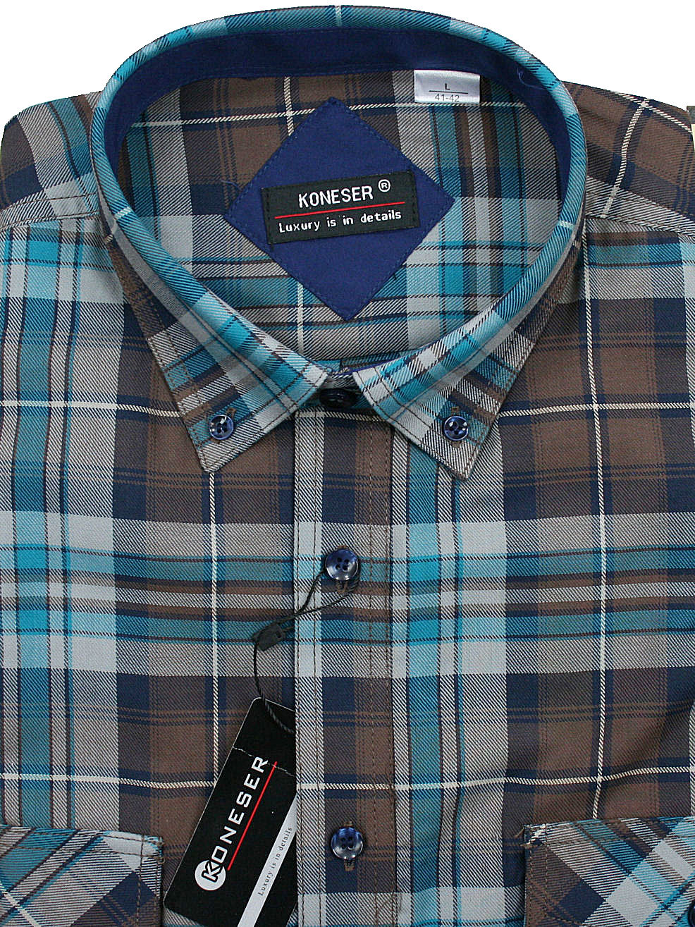 Koszula męska z długim rękawem, sylwetka klasyczna, dół koszuli zaokrąglony. Naszyte dwie kieszenie z patkami, zapinane na guzik. Spodnia część plisy oraz wew. strony stójki i mankietów w kolorze kontrastowym Kołnierzyk przypinany guzikami. Miękka tkanina bawełniana.
