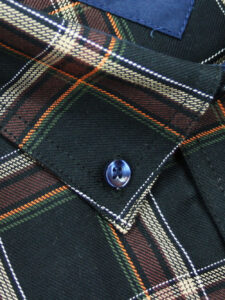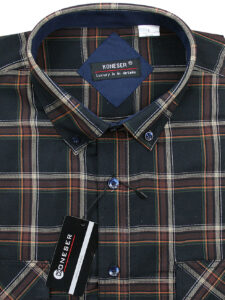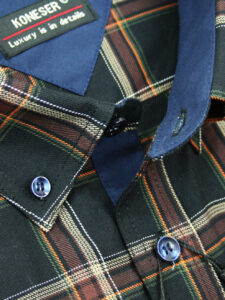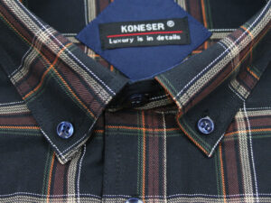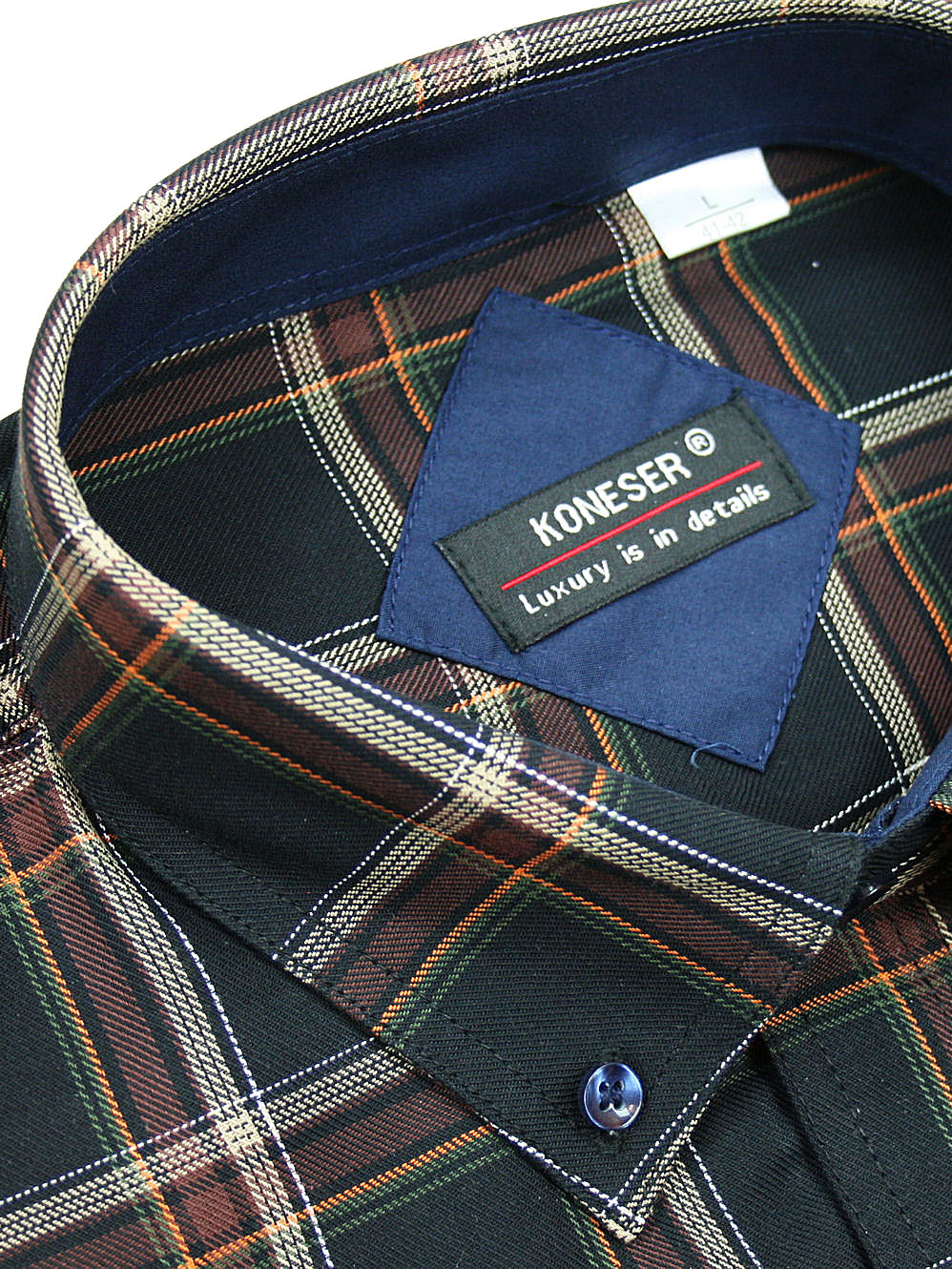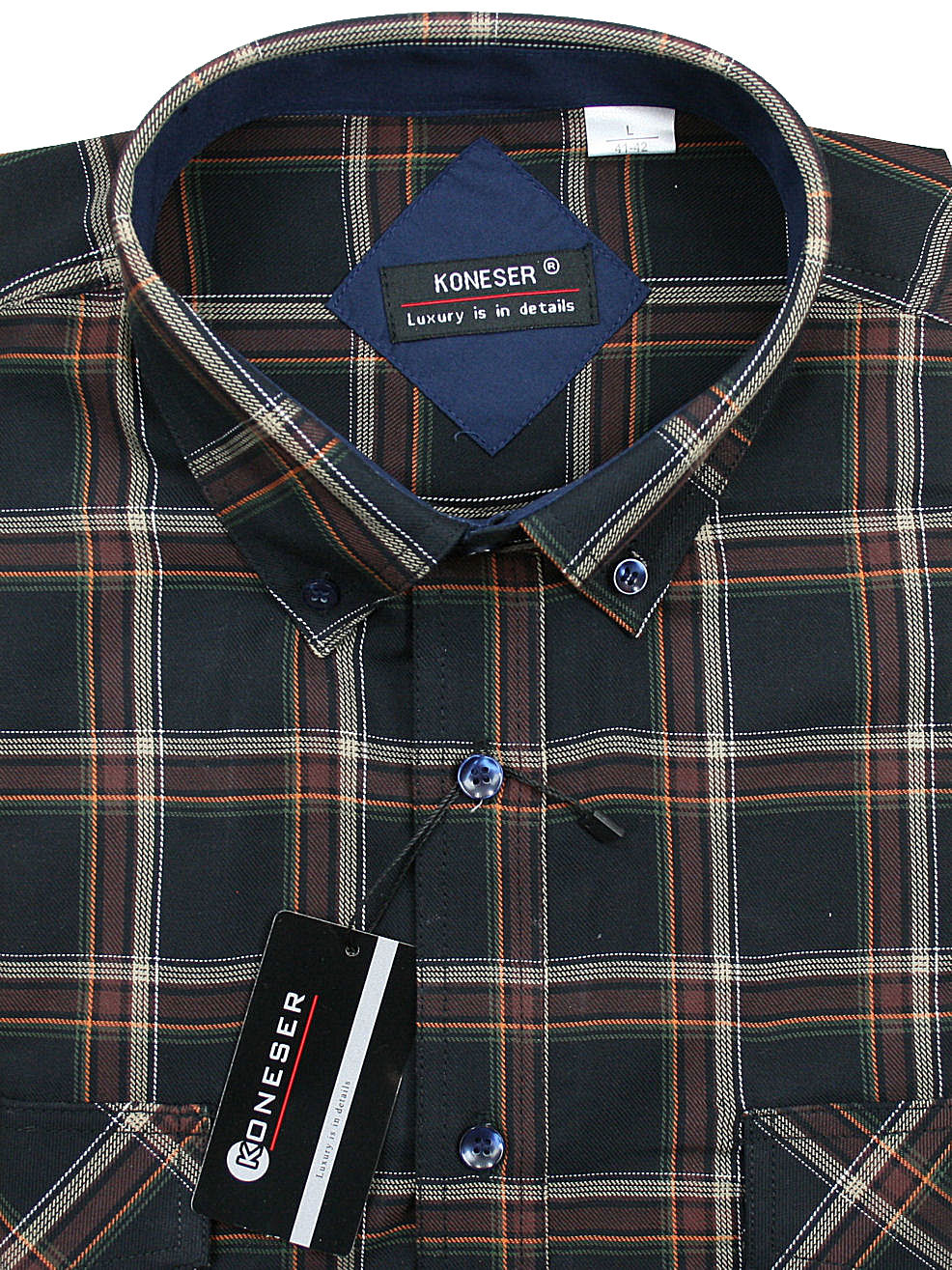 Koszula męska z długim rękawem, sylwetka klasyczna, dół koszuli zaokrąglony. Naszyte dwie kieszenie z patkami, zapinane na guzik. Spodnia część plisy oraz wew. strony stójki i mankietów w kolorze kontrastowym Kołnierzyk przypinany guzikami. Miękka tkanina bawełniana.