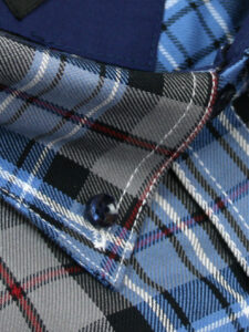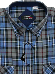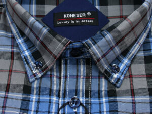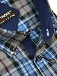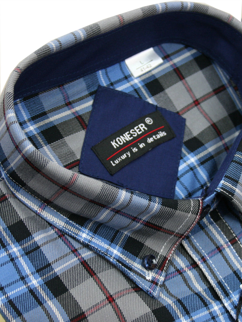 Koszula męska z długim rękawem, sylwetka klasyczna, dół koszuli zaokrąglony. Naszyte dwie kieszenie z patkami, zapinane na guzik. Spodnia część plisy oraz wew. strony stójki i mankietów w kolorze kontrastowym Kołnierzyk przypinany guzikami. Miękka tkanina bawełniana.