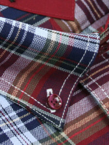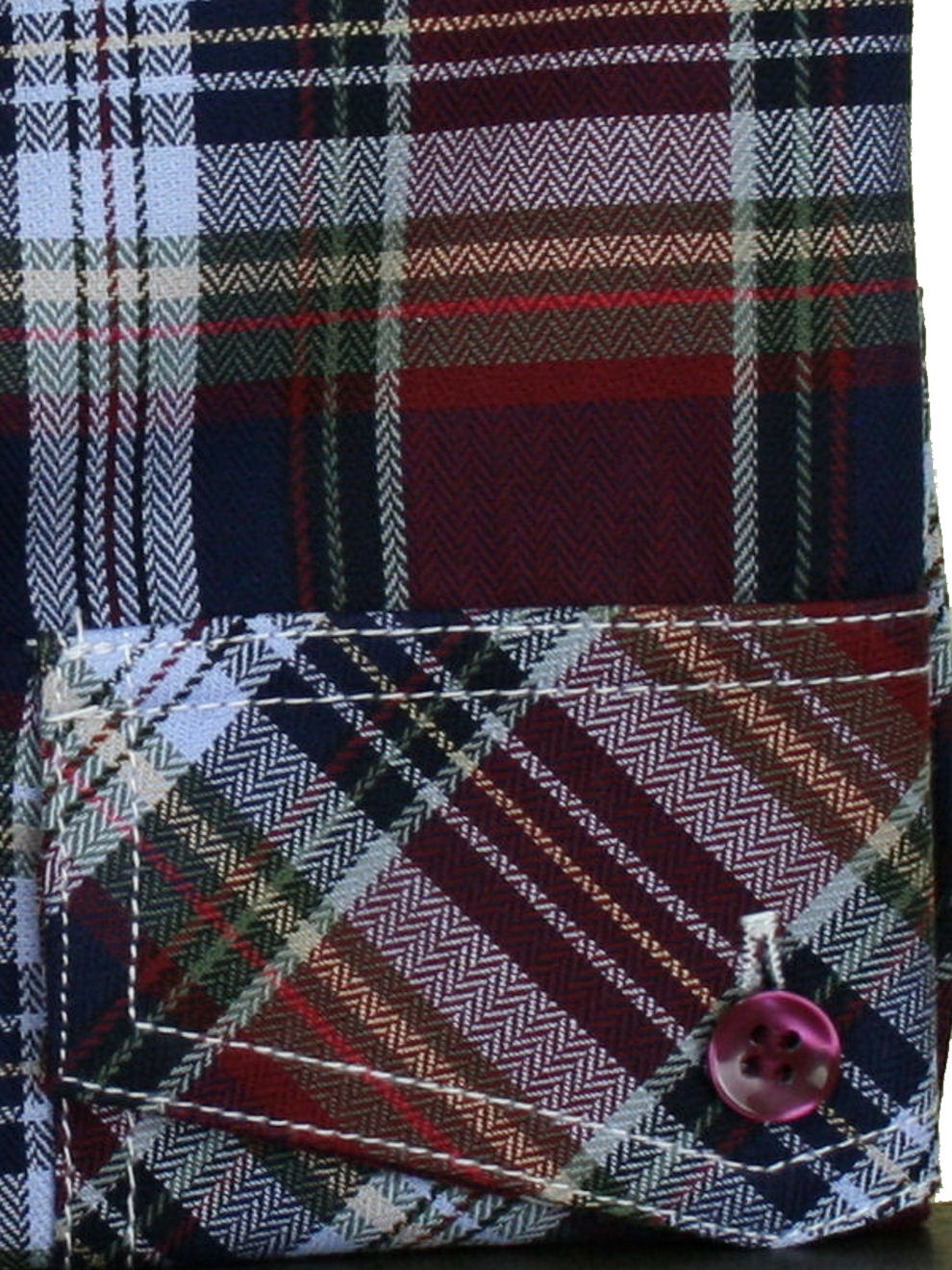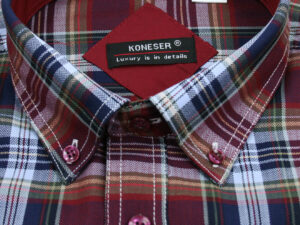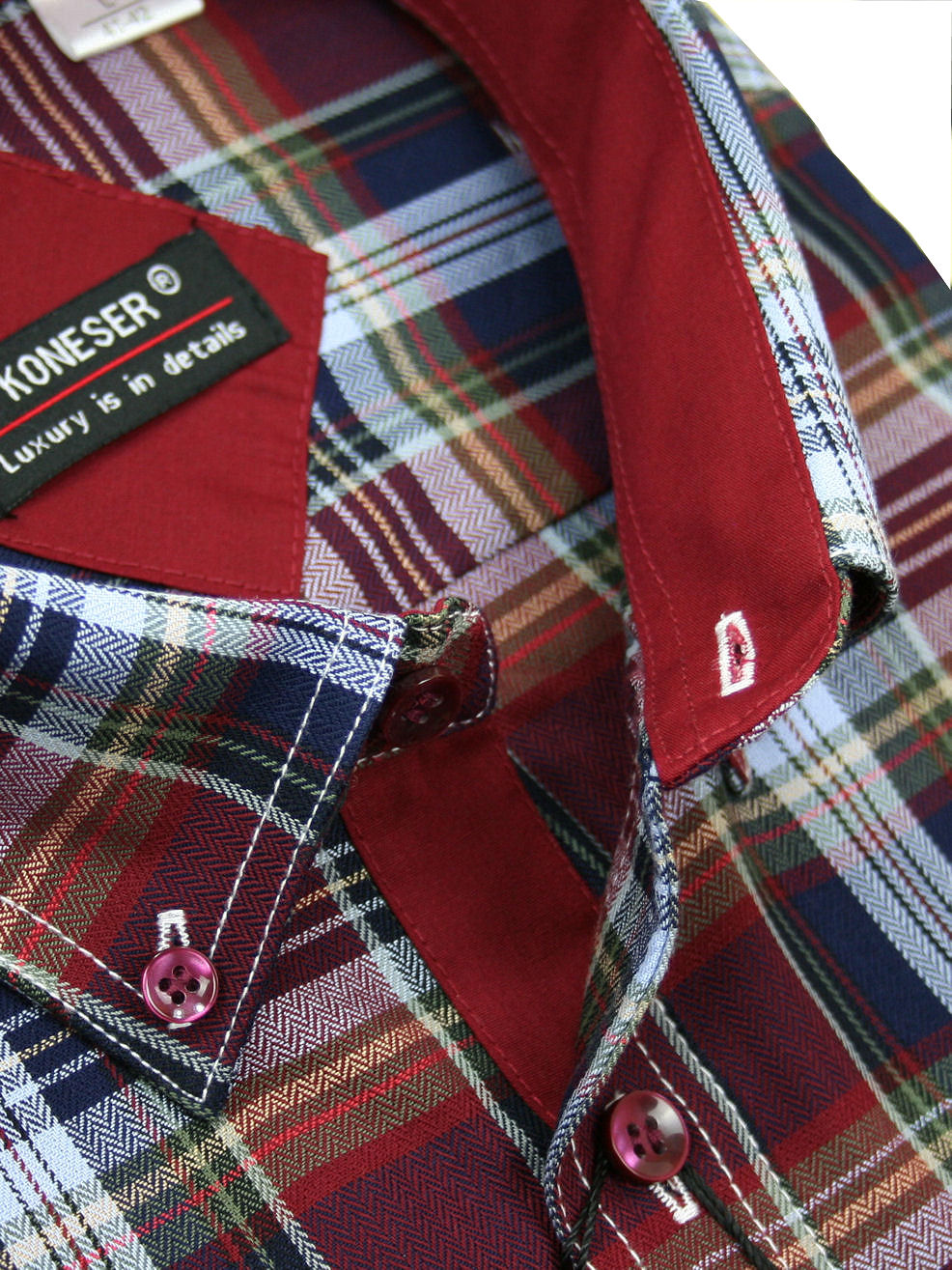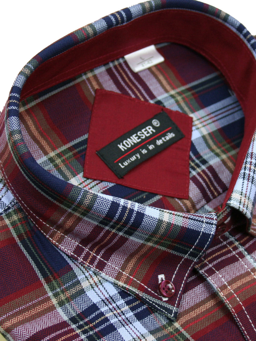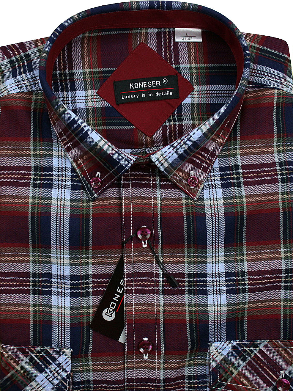 Koszula męska z długim rękawem, sylwetka klasyczna, dół koszuli zaokrąglony. Naszyte dwie kieszenie z patkami, zapinane na guzik. Spodnia część plisy oraz wew. strony stójki i mankietów w kolorze kontrastowym Kołnierzyk przypinany guzikami. Miękka tkanina bawełniana.