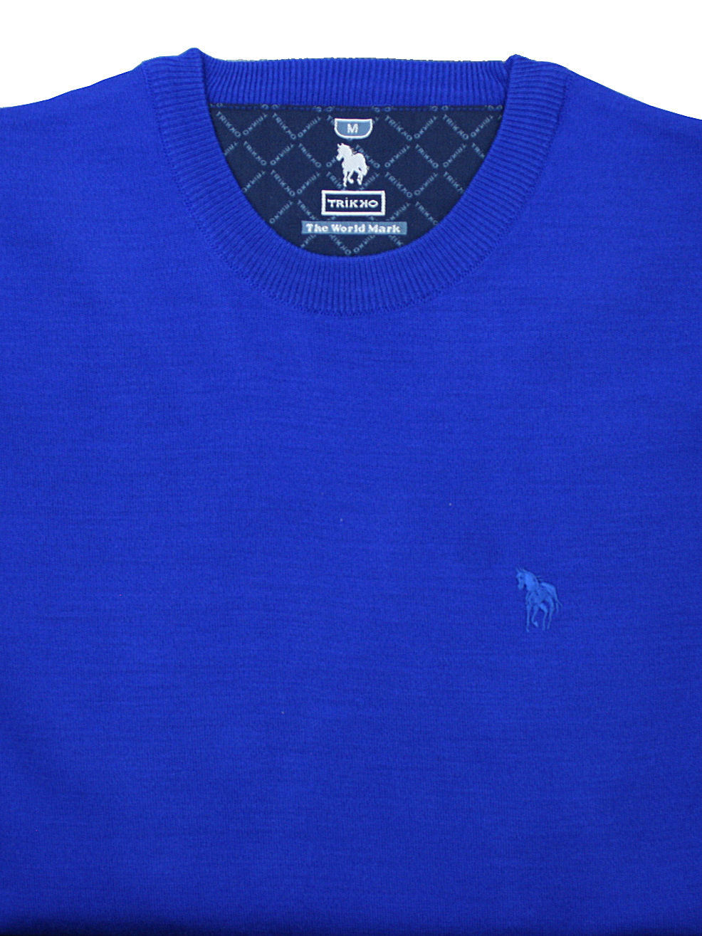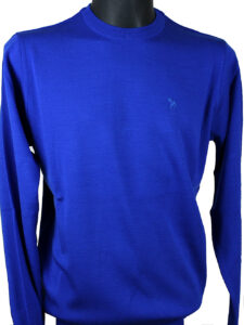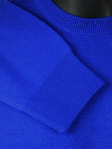 Cienki sweter wełniany, dekolt okrągły niska stójka, rękawy i dół swetra zakończone ściągaczem