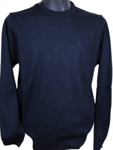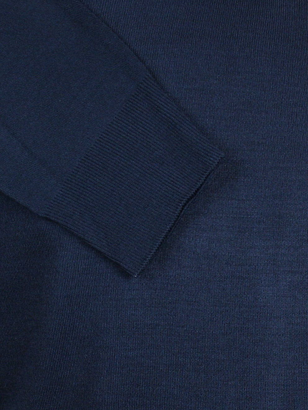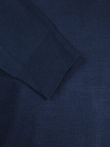 Cienki sweter wełniany, dekolt okrągły niska stójka, rękawy i dół swetra zakończone ściągaczem