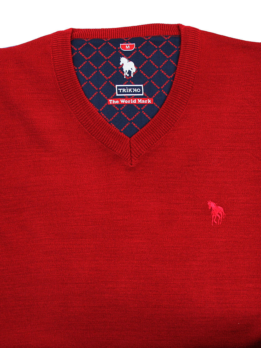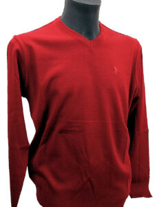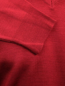 Cienki sweter wełniany, dekolt w serek, rękawy i dół swetra zakończone ściągaczem